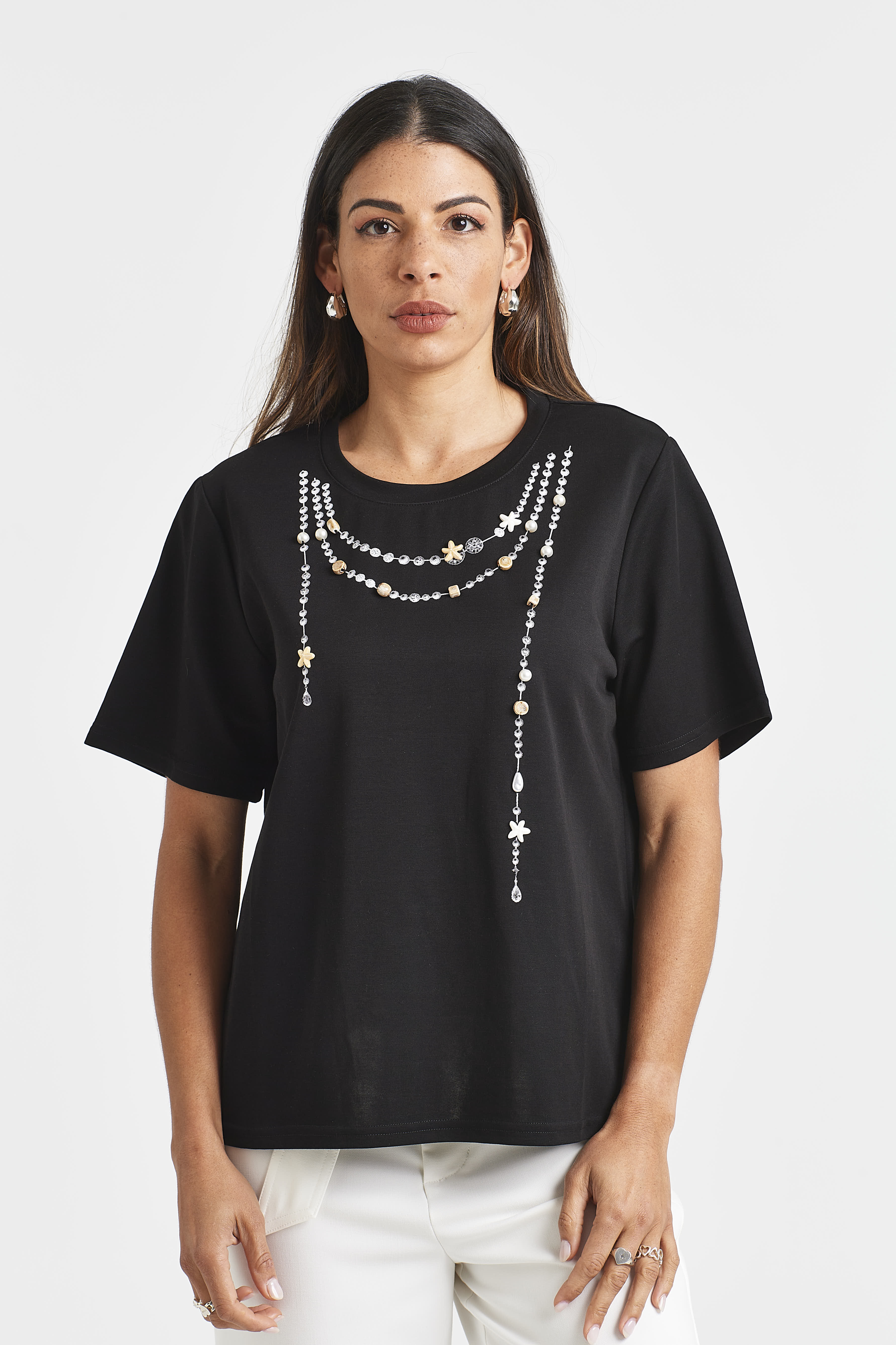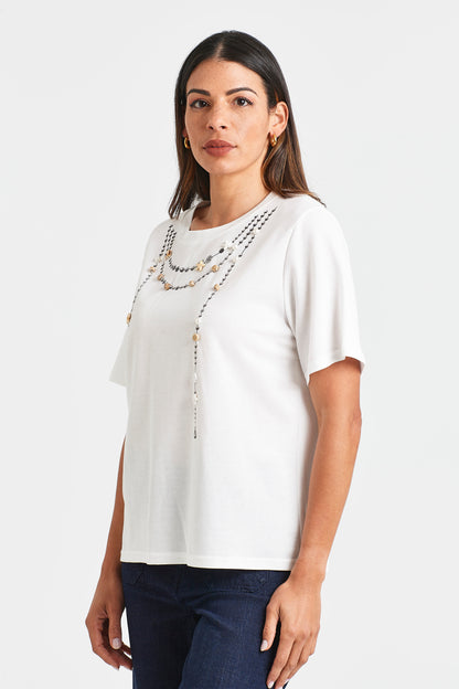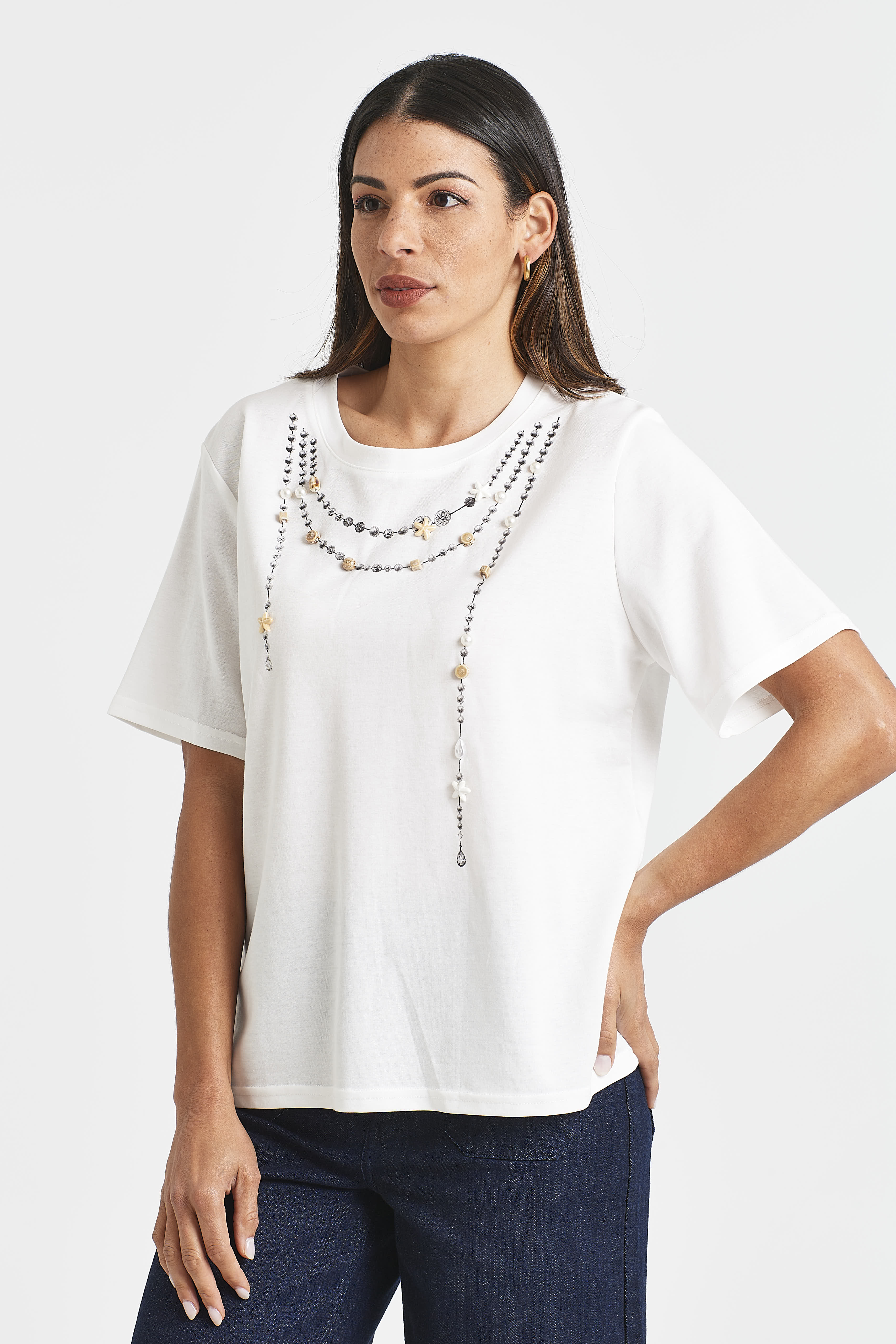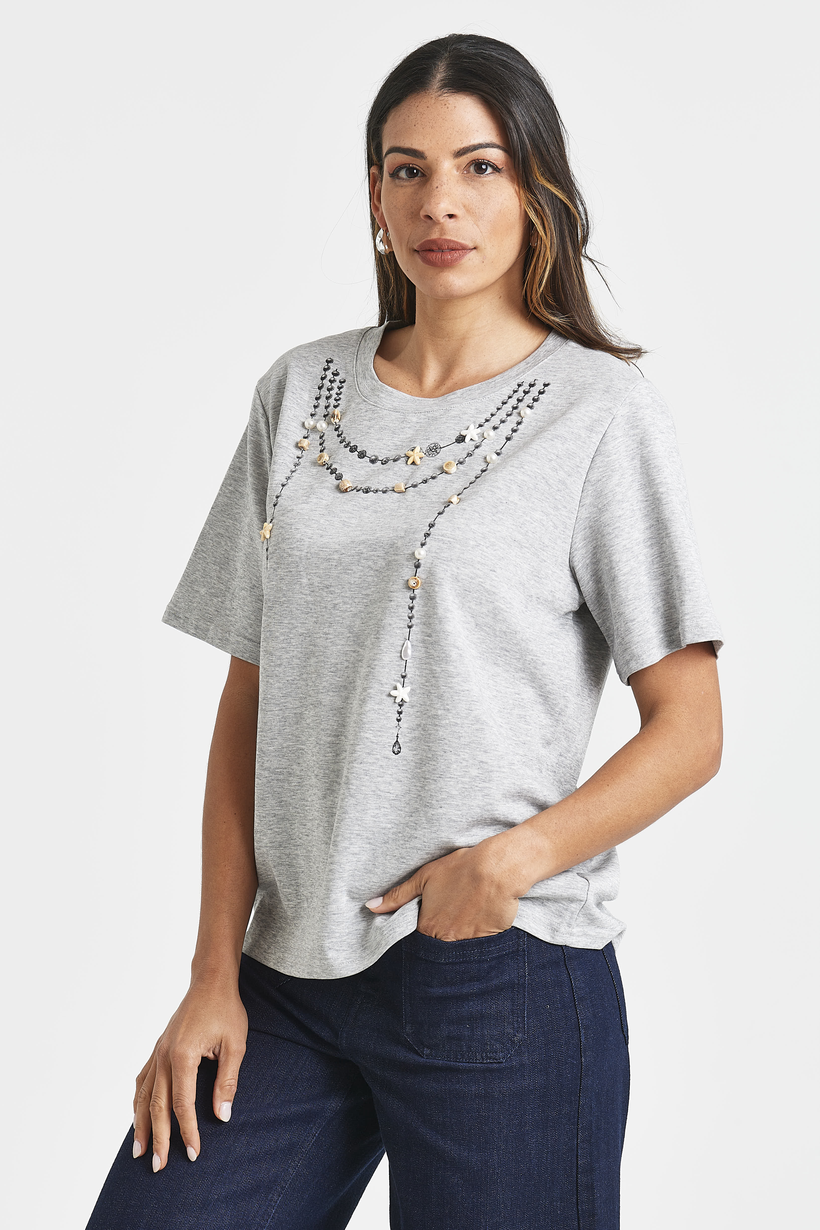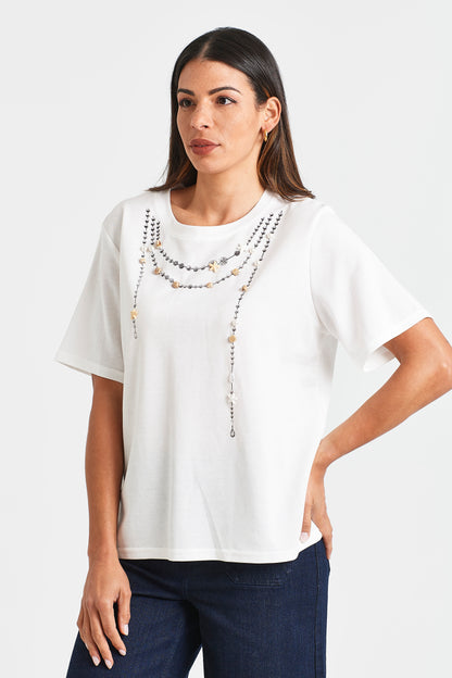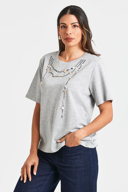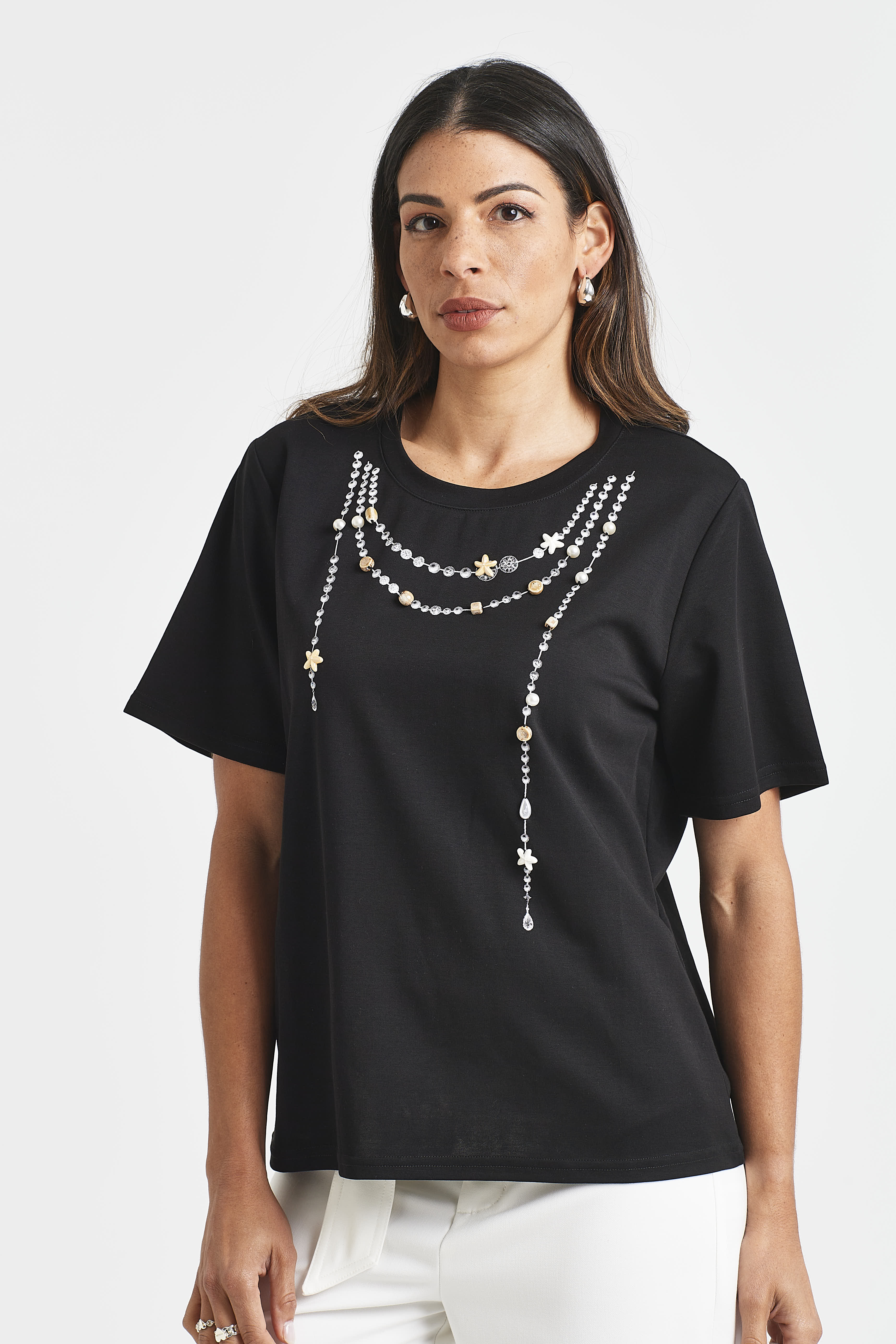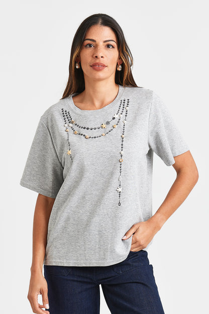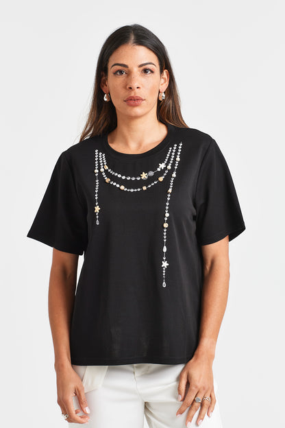 The Adrien Tee is a relaxed-fit staple available in black, grey, and white. Featuring a delicate pearl print with beaded detailing, it adds a touch of elegance to everyday casual wear.