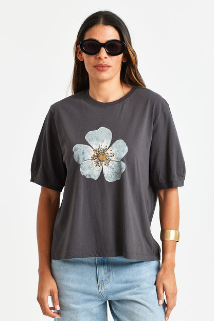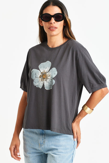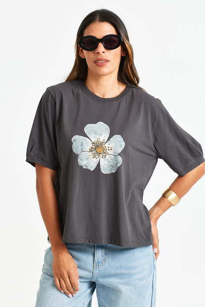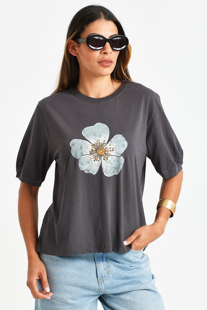 The AIME TEE is a relaxed-fit grey cotton tee with a subtle twist. Featuring softly puffed sleeves and a delicate flower print at the chest add a touch of femininity to this everyday essential. Easy, understated, and effortlessly wearable.