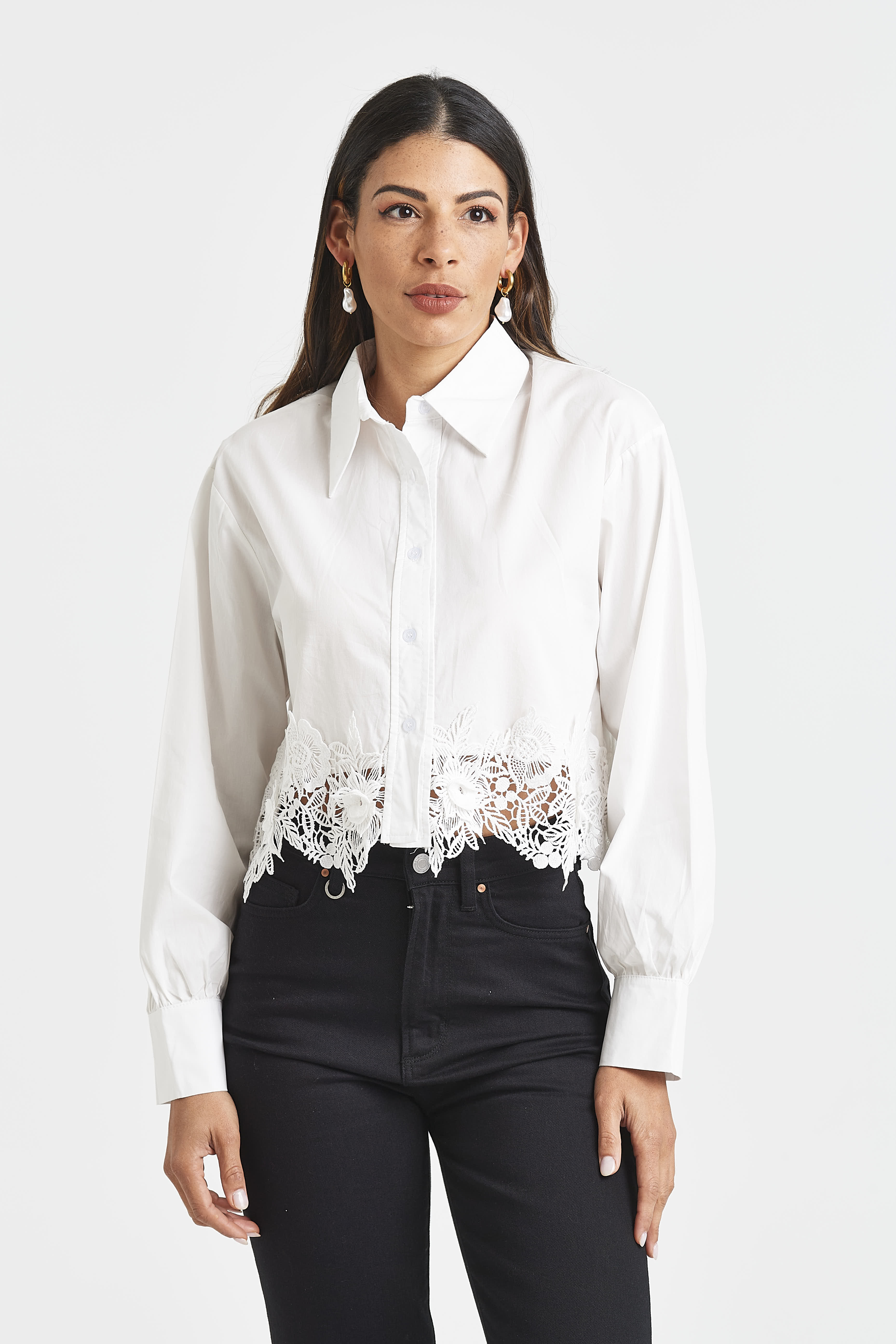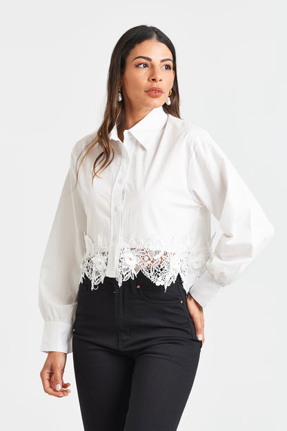 Charming and feminine, the Alida Shirt is a crisp white cropped style with a button-through front and slightly ballooned sleeves. Finished with stunning lace detailing along the hem, it’s the perfect blend of playful and polished.