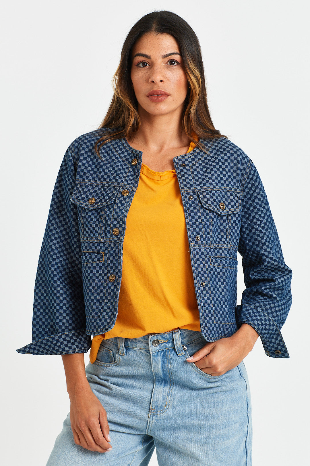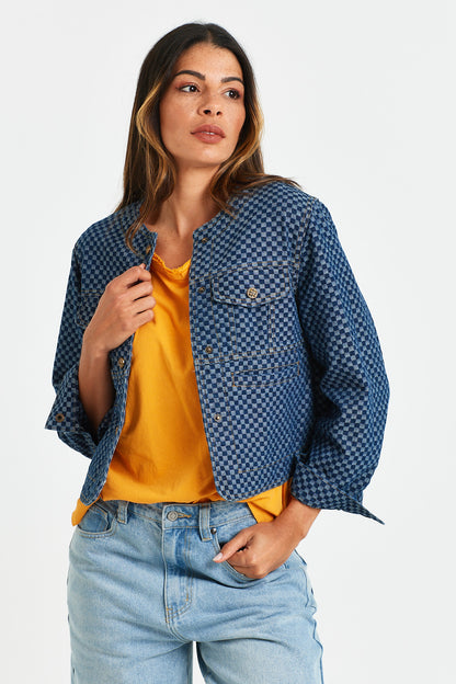 A fresh take on a classic, the Alvin Jacket is crafted from cotton denim with a bold checked design. Featuring front patch pockets and timeless structure, it’s a standout layer for everyday wear.