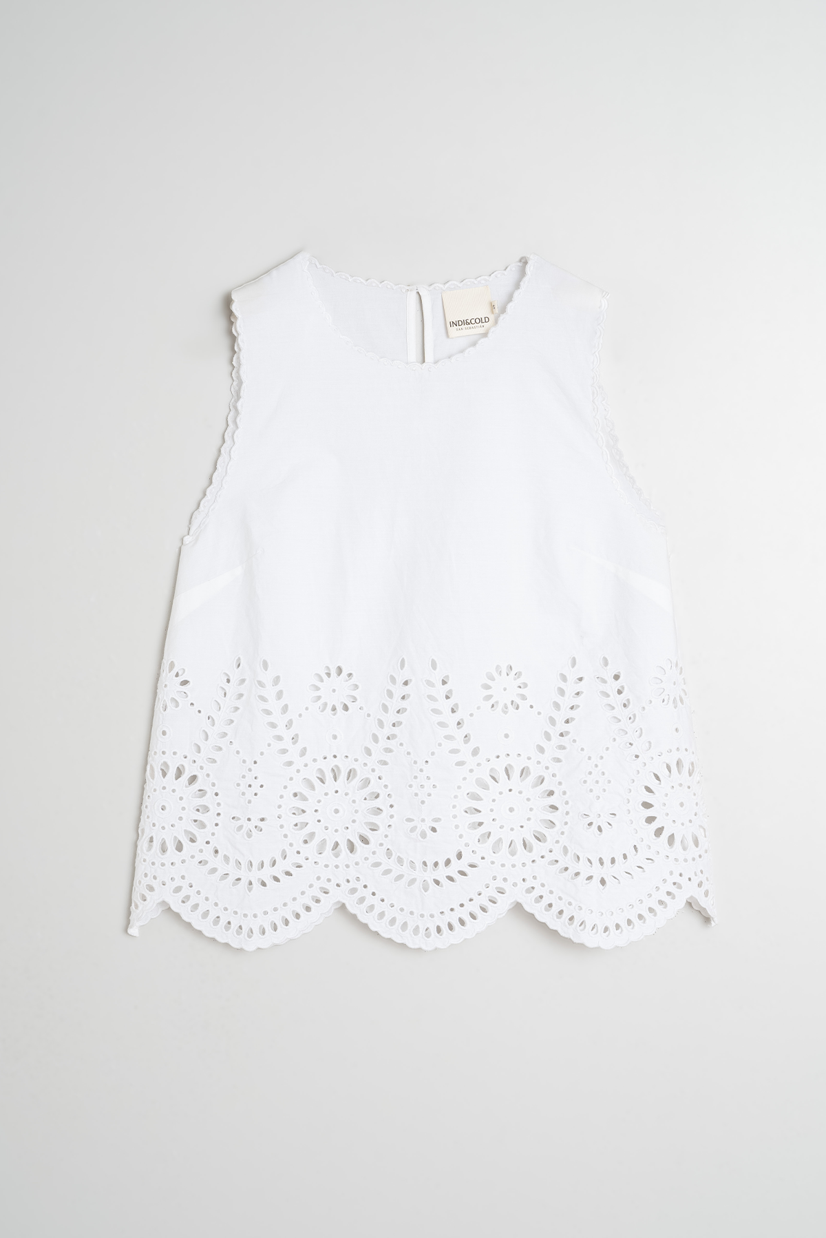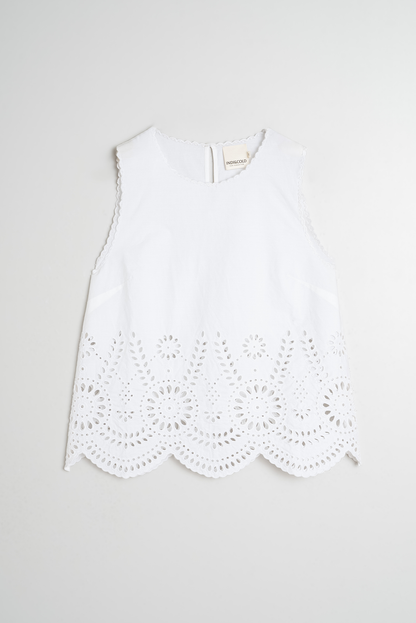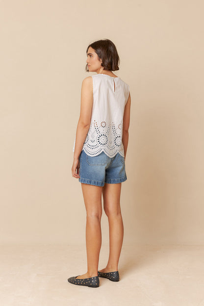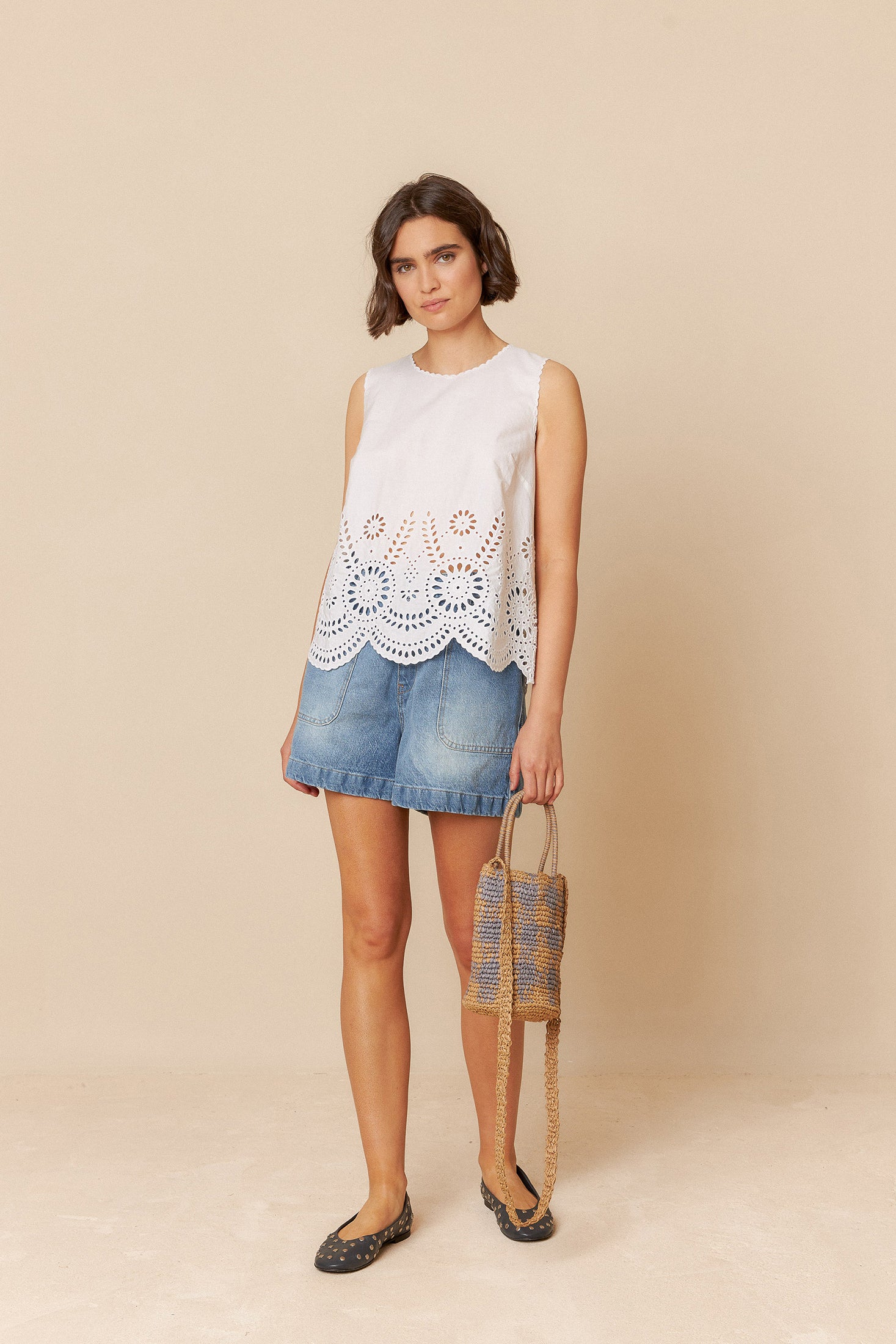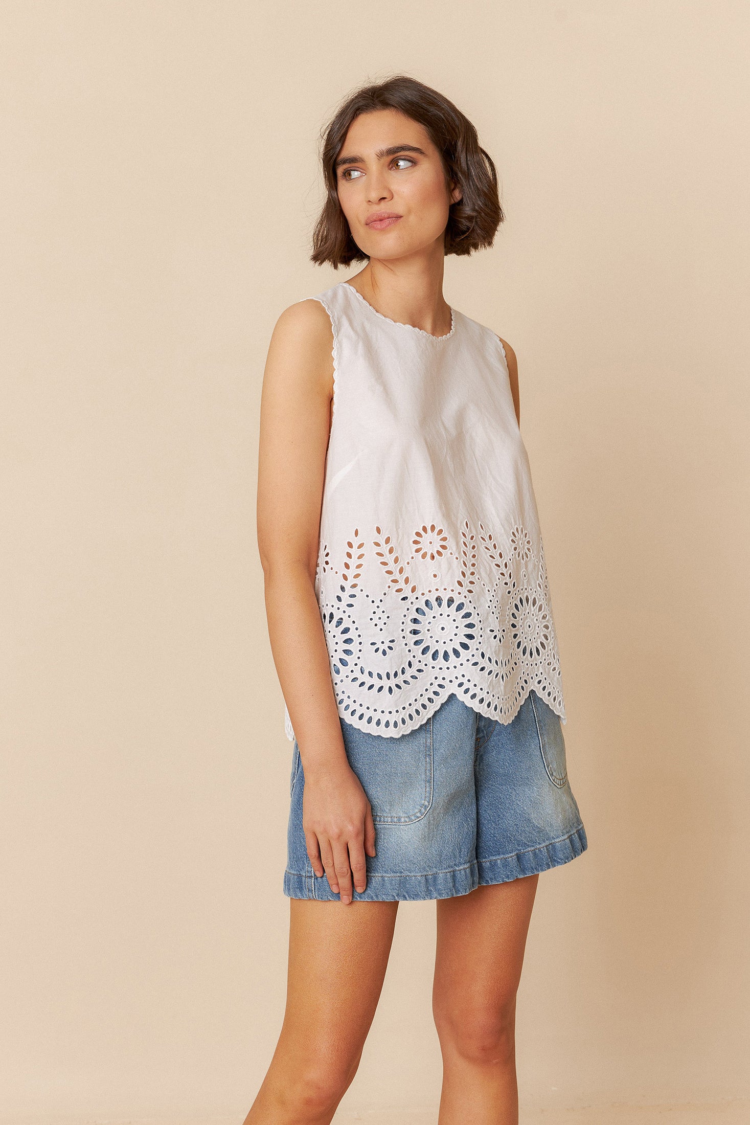 This cotton poplin crop has a teardrop and button closure at the back and has an all-over embroidered and hand-trimmed bottom. This crop is slightly short.