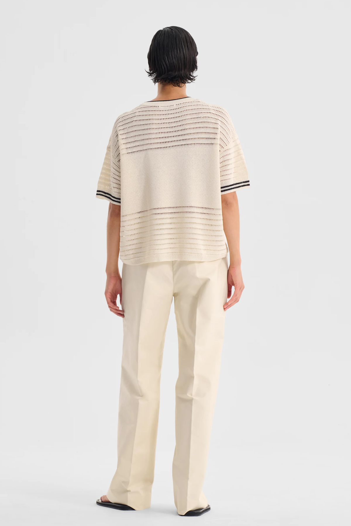 The Dallas Knit Tee is crafted from a luxe cotton-blend yarn, it features an open mesh stitch throughout, elbow-length sleeves, and refined jersey stitch paneling at the chest. Contrast stripe detailing at the neck and sleeves adds a modern touch, while ribbed trims and a relaxed, boxy silhouette ensure an understated yet polished finish.