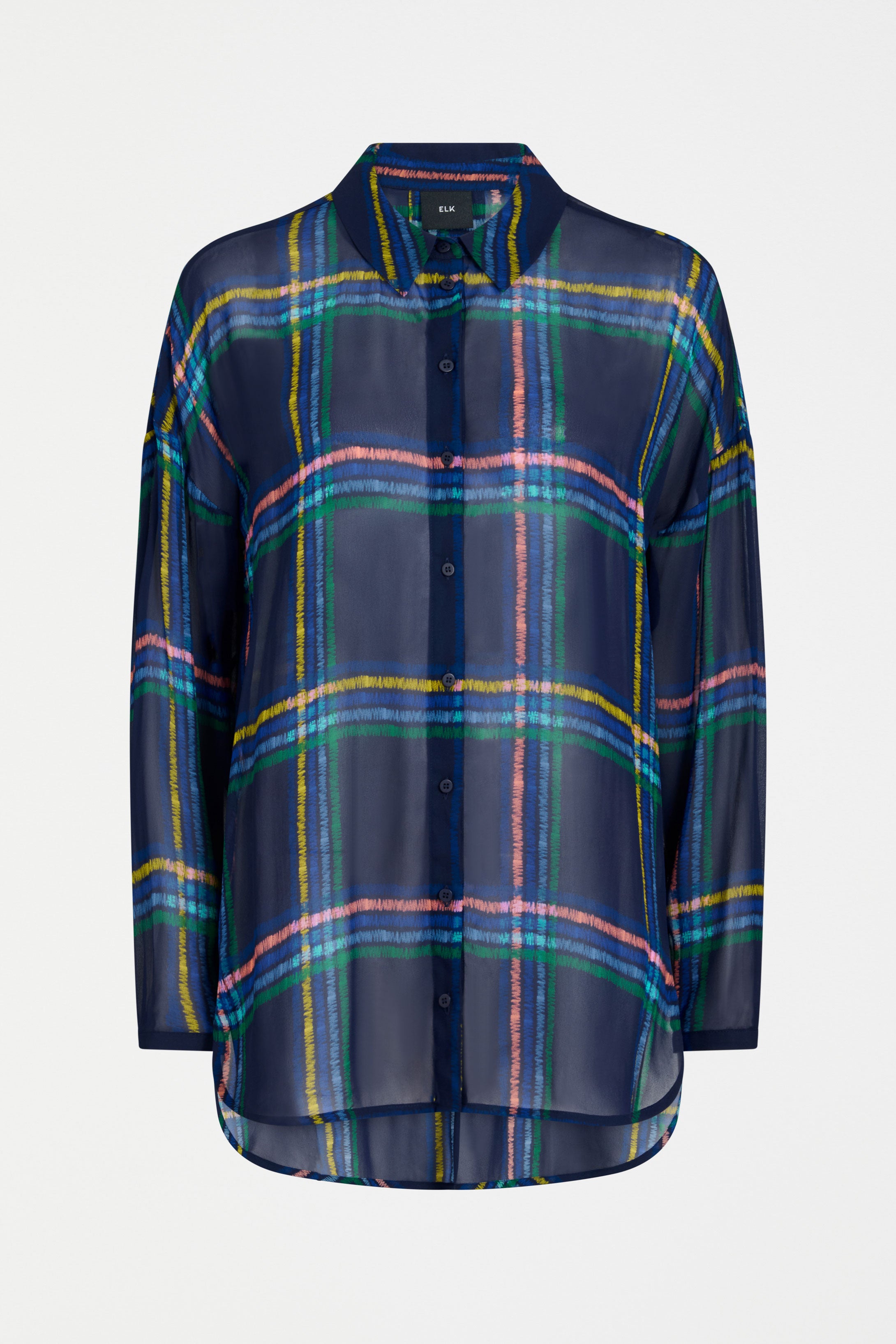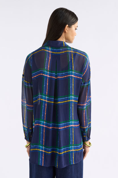 Elevate your everyday style with the EIR SHEER SHIRT, crafted from lightweight navy check viscose chiffon. This relaxed-fit shirt features a flattering scooped hem that drapes longer at the back, along with a drop shoulder for an effortlessly laid-back silhouette. Sheer and breathable as we move through the seasons.
