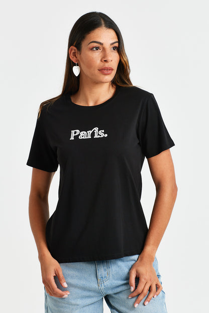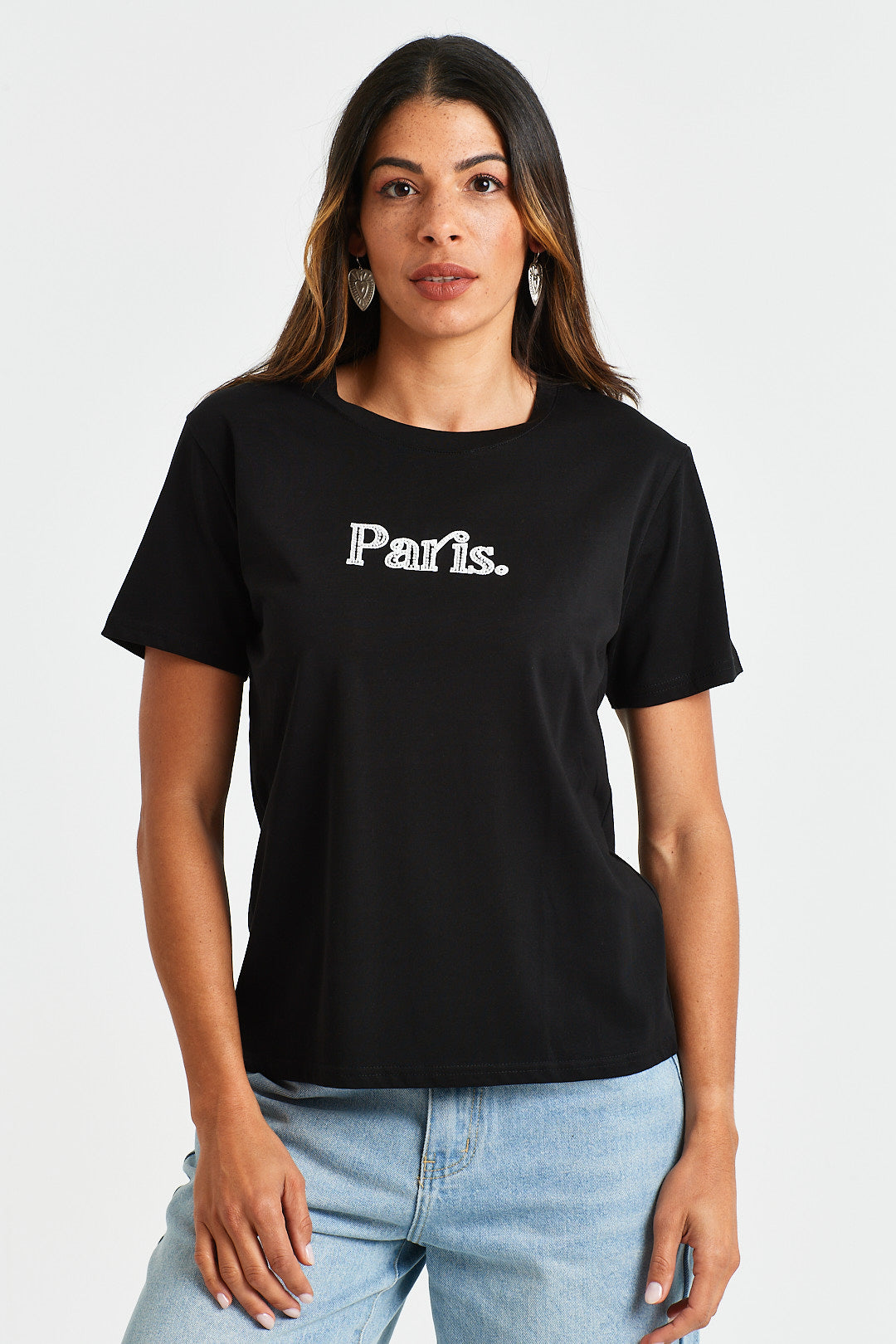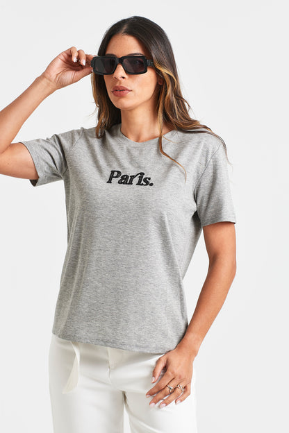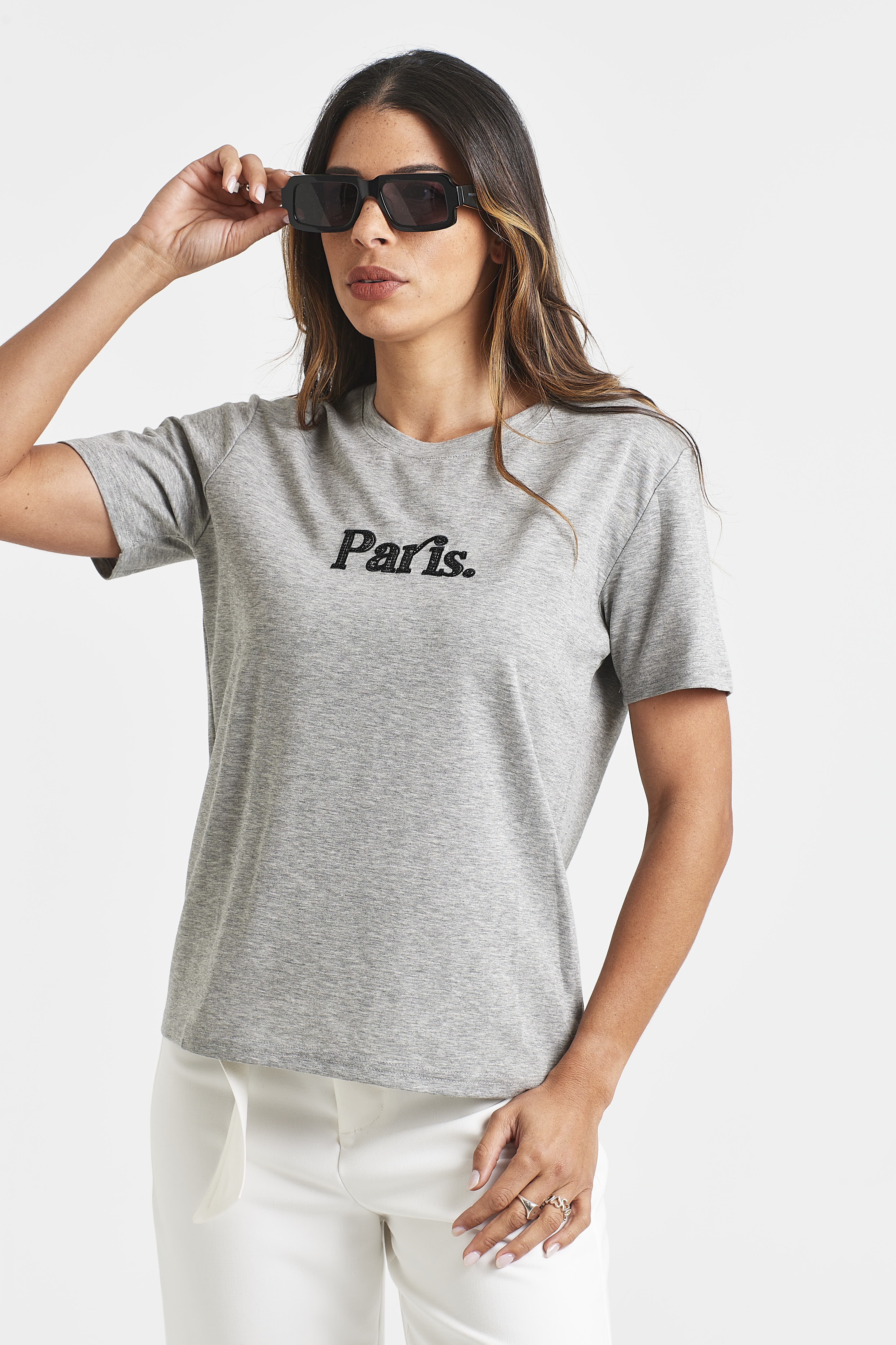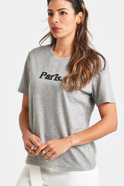 A timeless cotton tee with a refined edge, the Flux Tee features a classic silhouette in black or grey, elevated by delicate "Paris" embroidery and beadwork across the chest. Effortlessly simple with a subtle statement.
