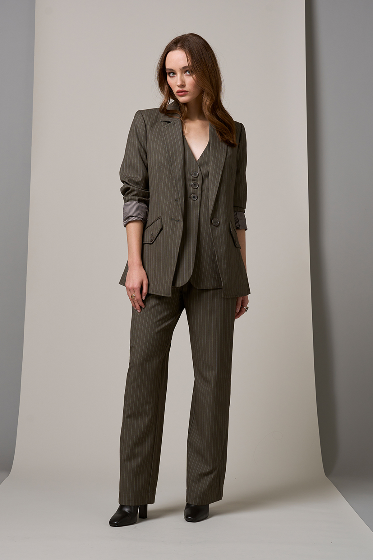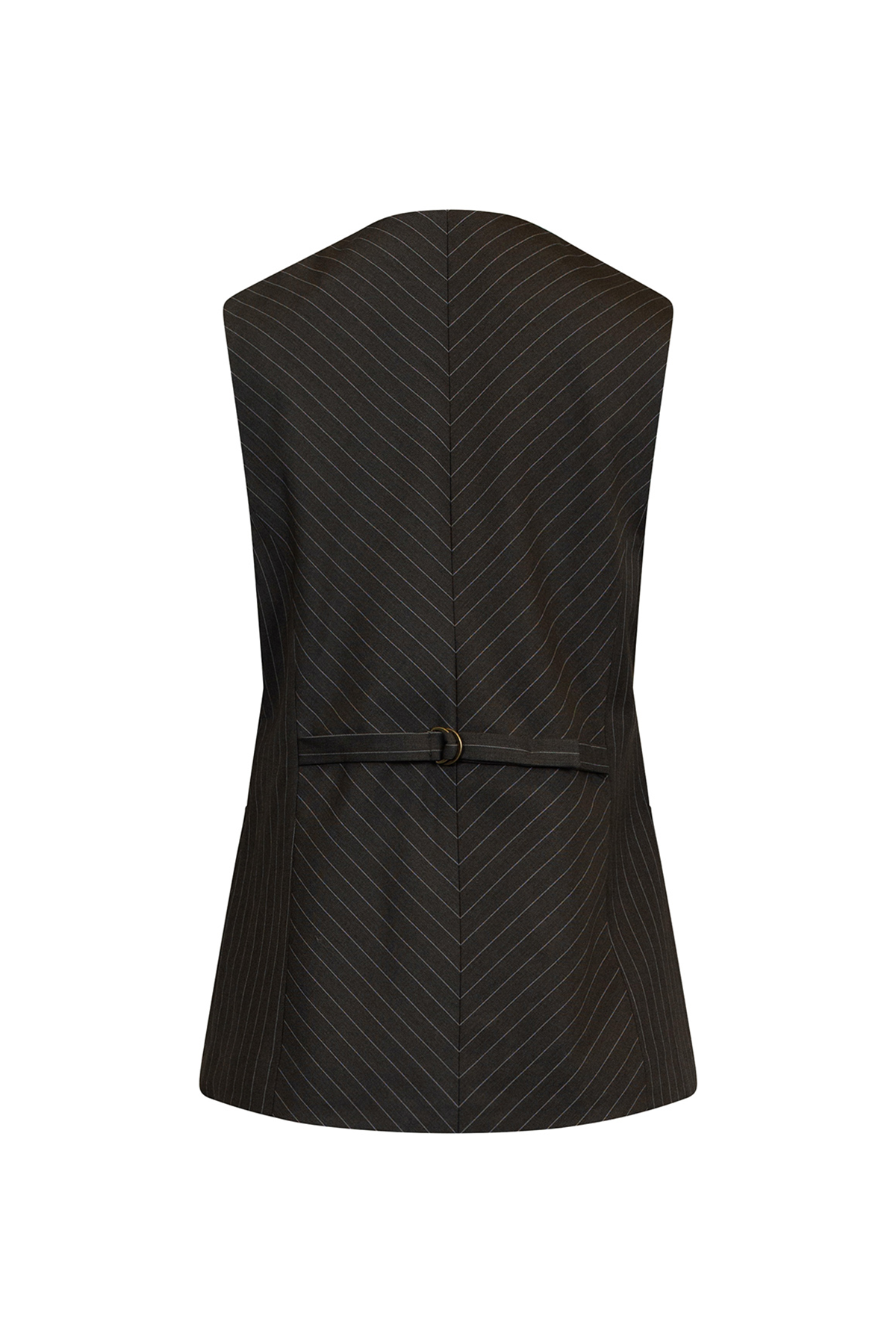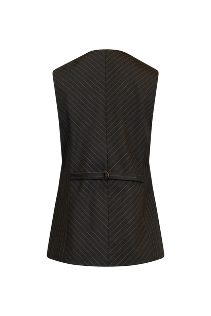 Sophisticated pinstripe longline vest with colour matched buttons and a cutaway front. Adjustable back waist with an antique brass buckle and tie.
