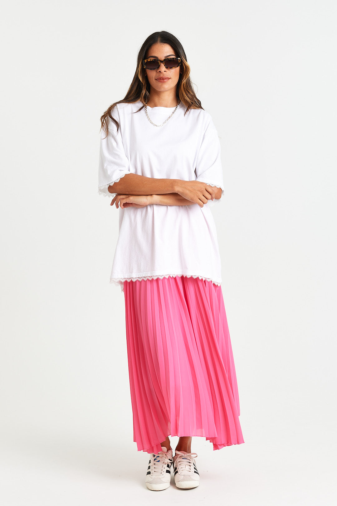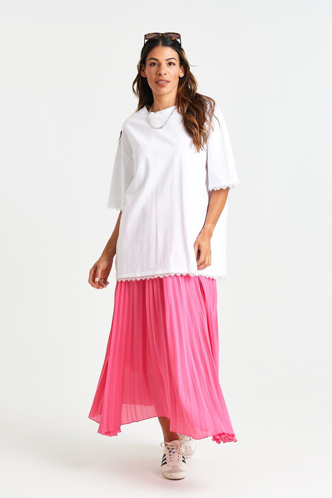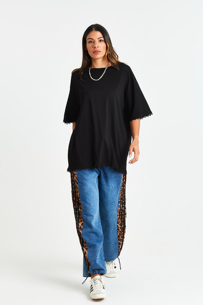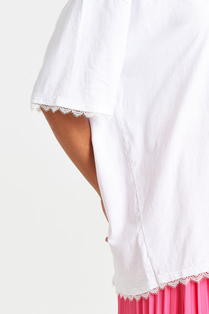 The JEAN TEE is an easy, oversized cotton tee available in classic black or white. Finished with delicate lace trim at the sleeves and hemline, it brings a soft, feminine touch to an everyday staple—perfect for an effortless lifestyle look.