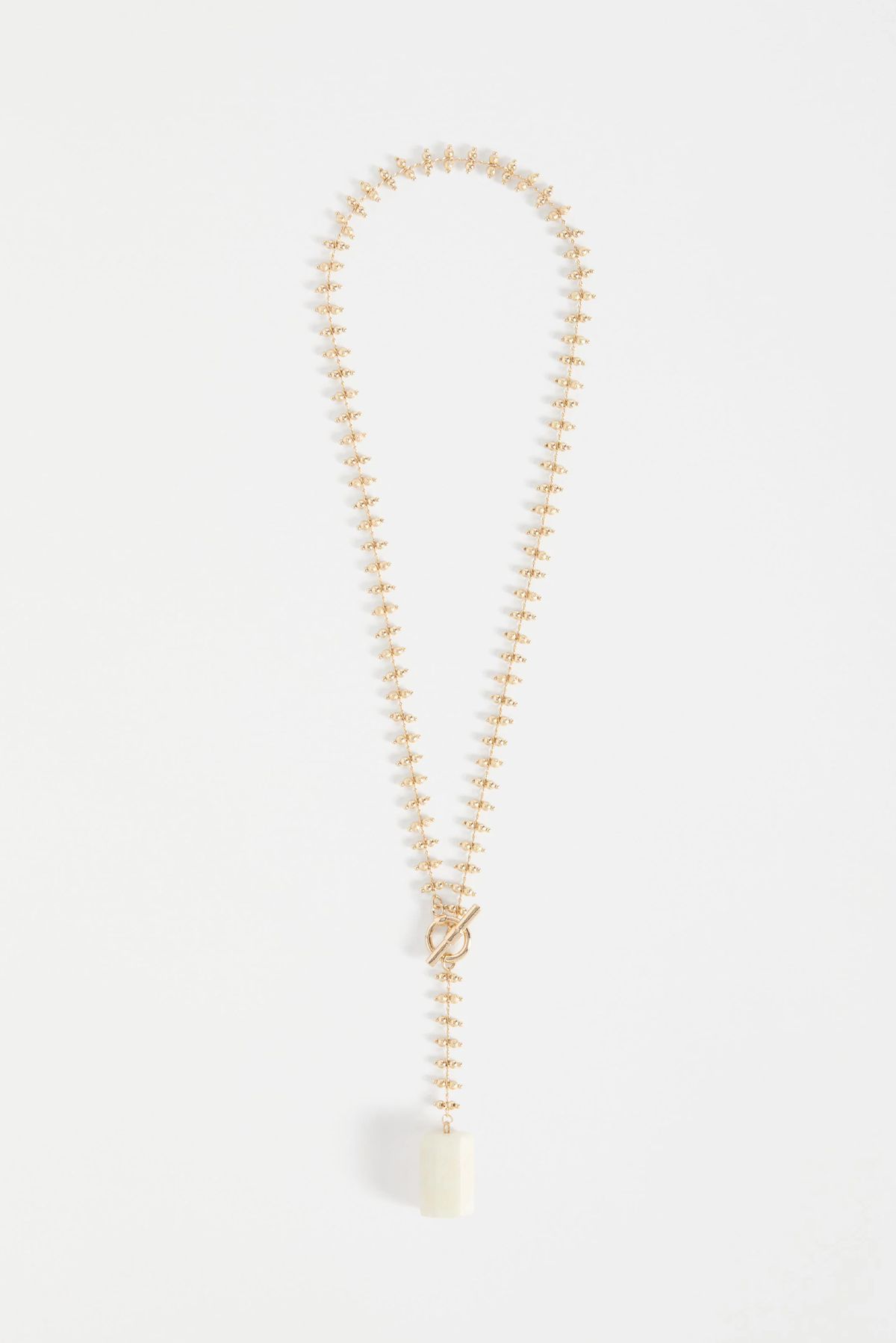 The Kivi Necklace is a statement necklace with an interesting beaded chain detail. The piece features a toggle closure at the bottom of the necklace, and a composite stone pendant.