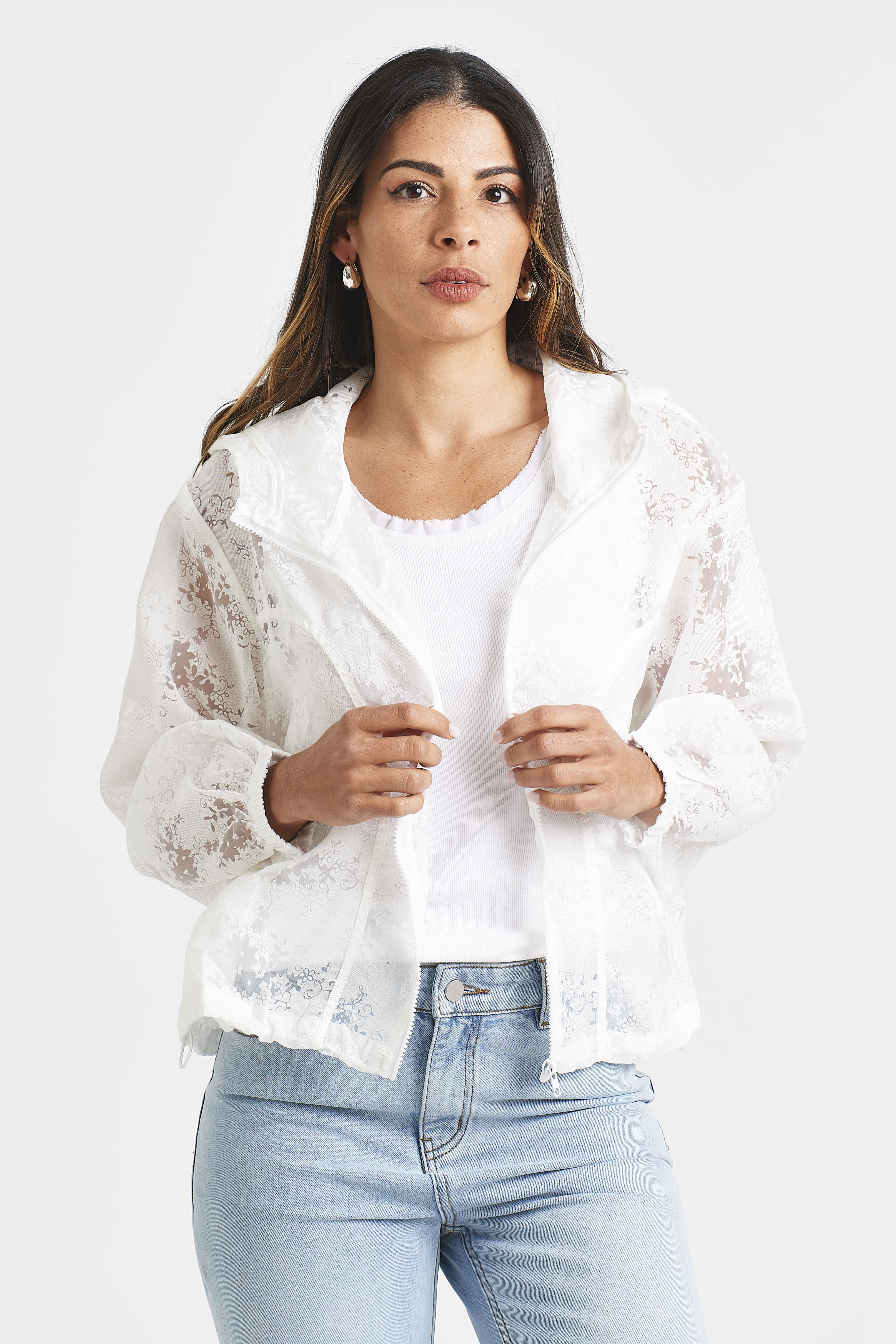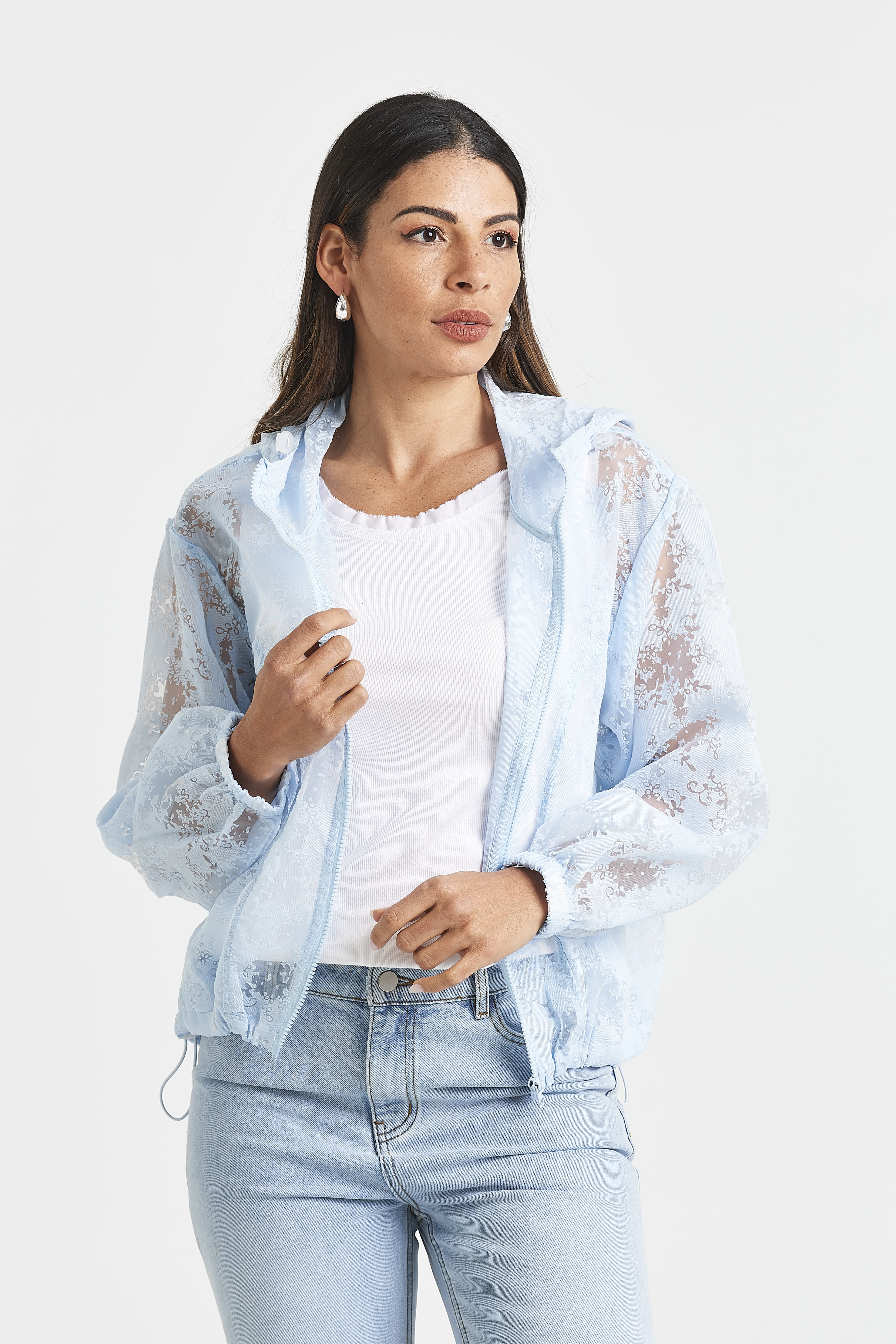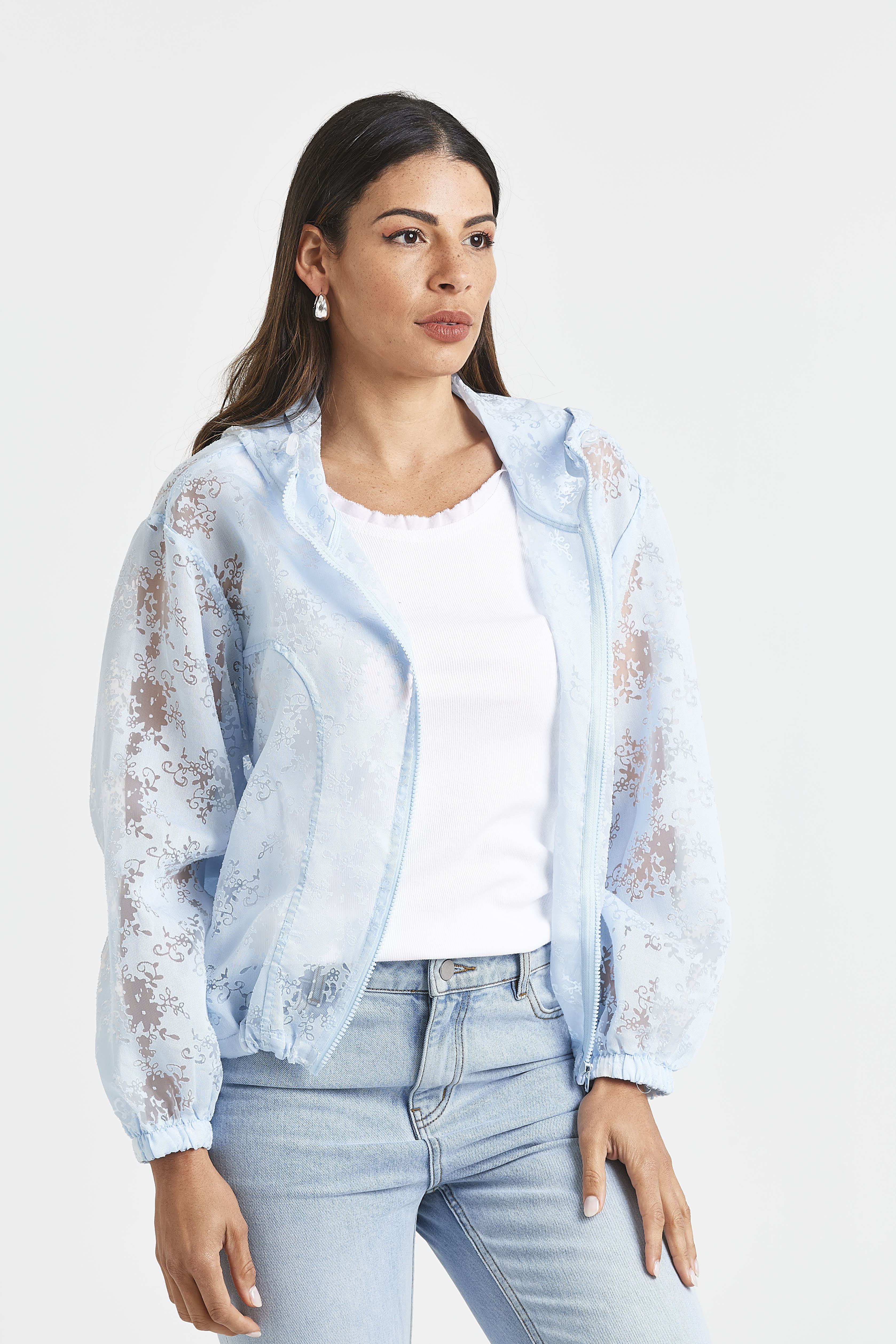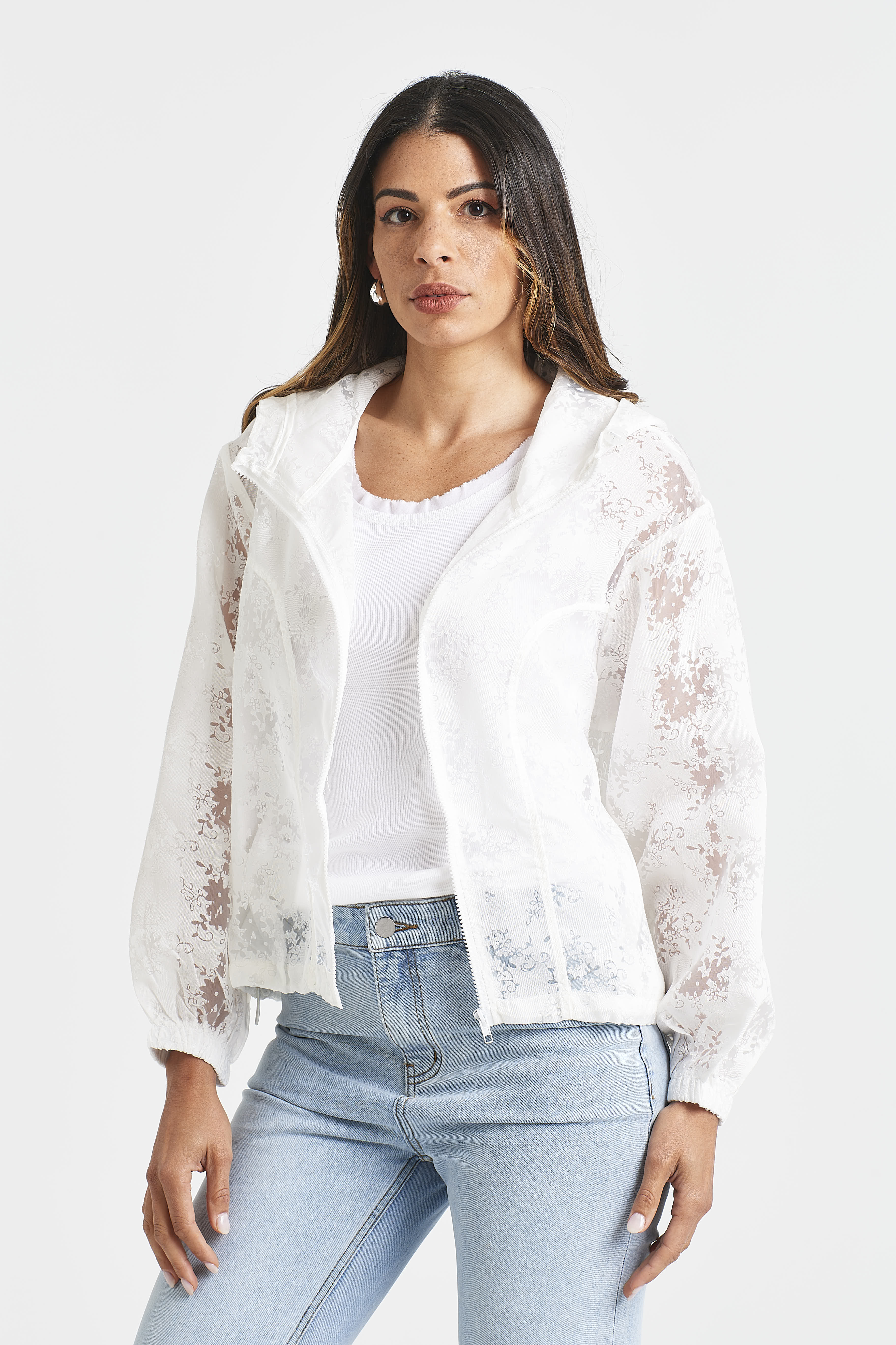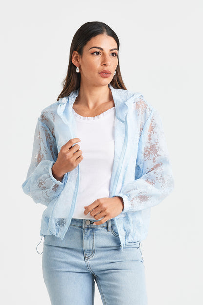 Light as air with a romantic twist, the LILLIANE JACKET features a sheer floral burnout design in your choice of white or blue. Finished with a hood, zip front, and an adjustable drawcord hem, it’s the perfect lightweight layer for breezy days.
