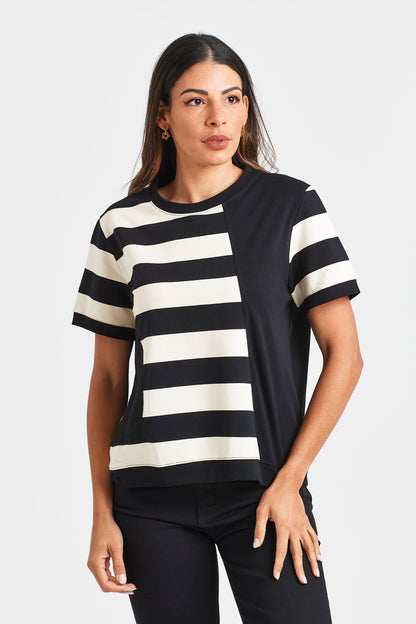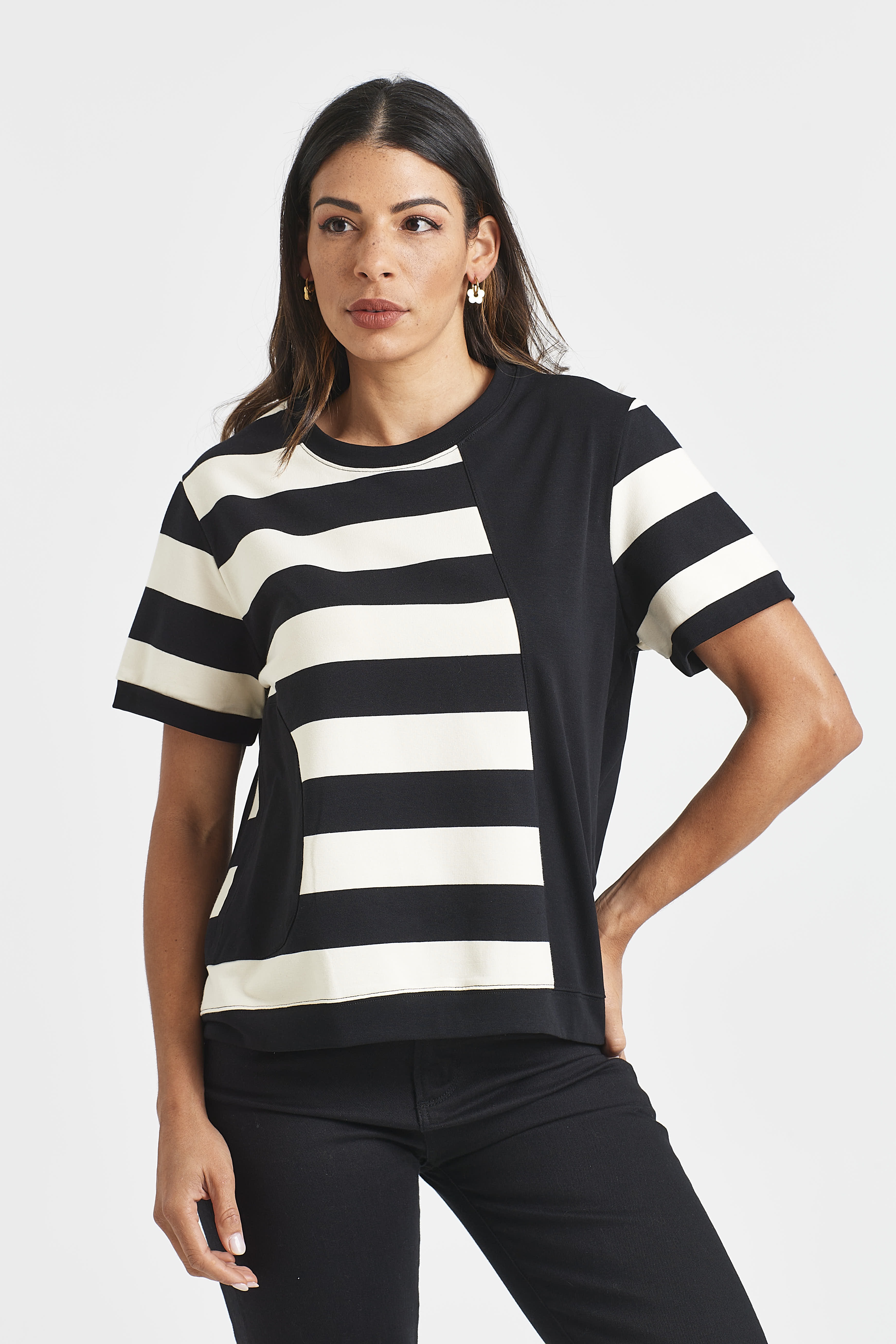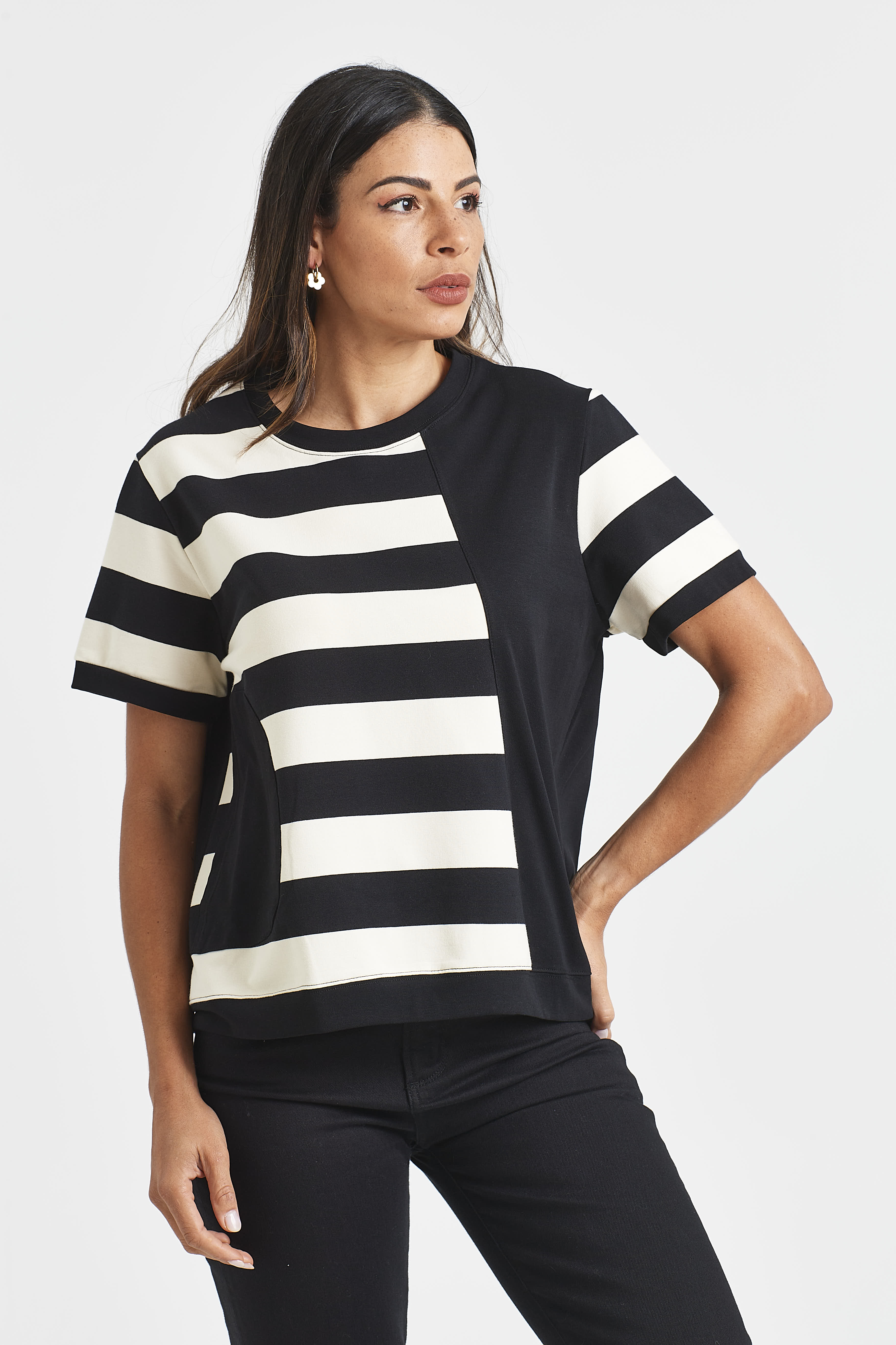 The Lise Tee offers a modern twist on a relaxed classic, featuring bold colour blocking and stripe detailing in black and natural tones. Made from a soft cotton-spandex blend, it delivers all-day comfort with a touch of sporty edge.