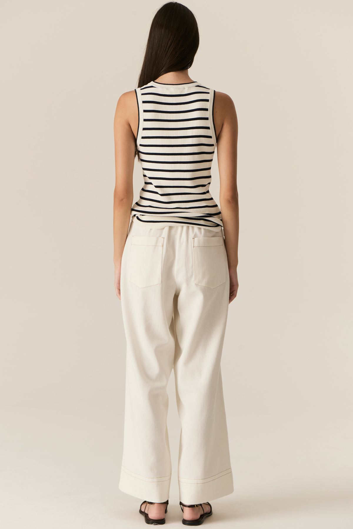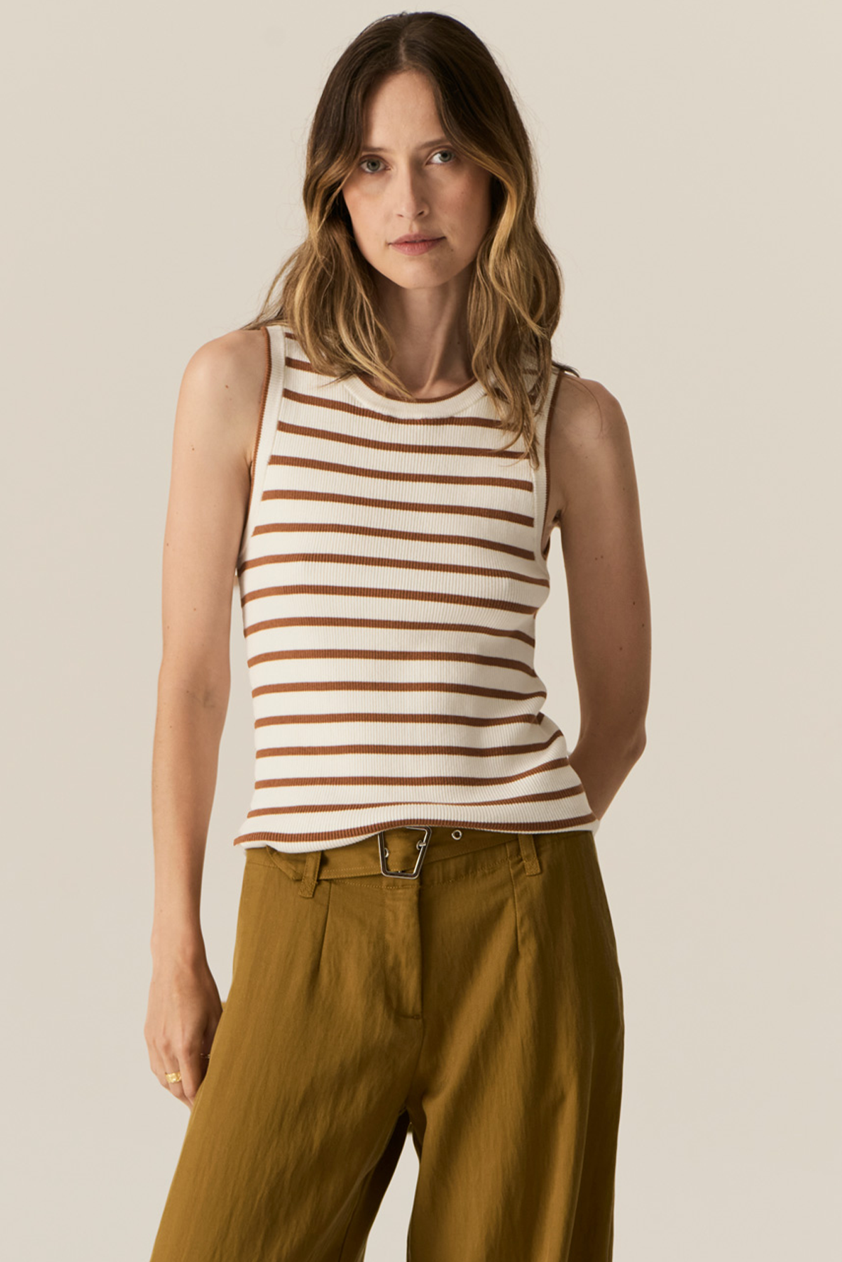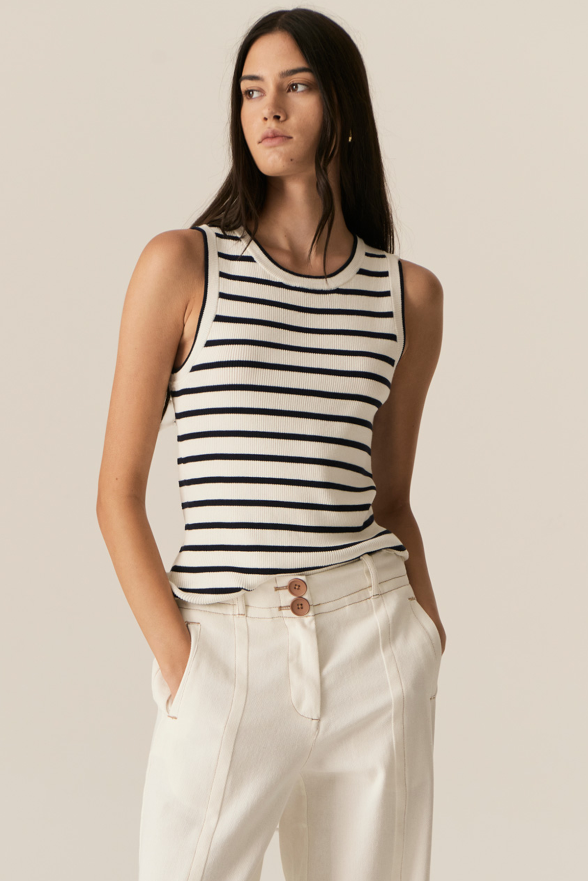 The Luca Tank is a spring-ready essential, crafted from a soft ribbed cotton-viscose blend for all-day comfort. Featuring a body-skimming fit with natural stretch, it’s finished with contrast striped ribbing at the neckline and armholes for a sporty touch. A versatile piece to wear on its own or layered.