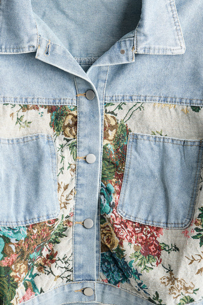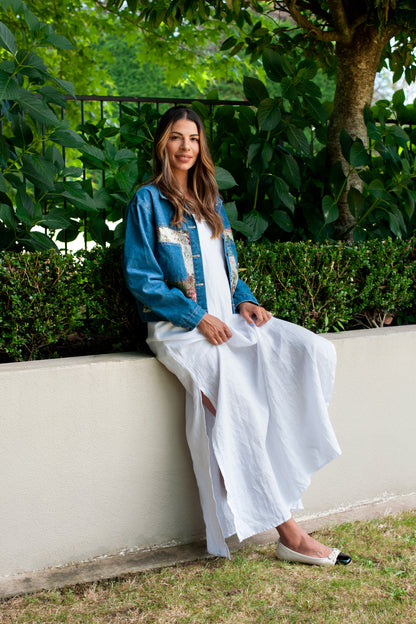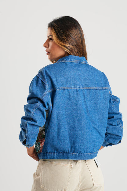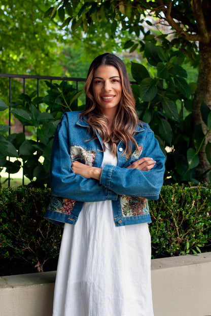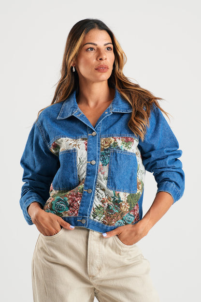 The Mara Jacket is a striking play on a classic denim jacket. The floral patchwork detailing is the star of the show, making this a go-to piece for elevating and adding a bit of fun to any look. It features front pockets, cropped length and metal button fastenings.