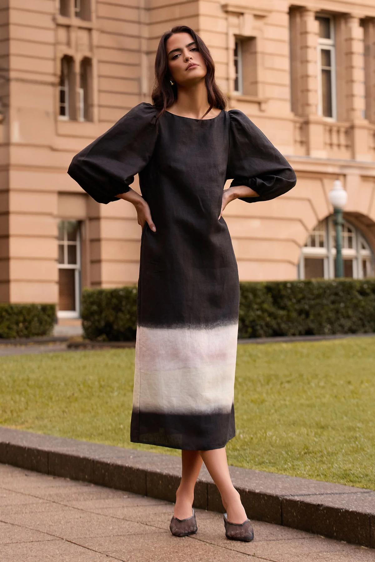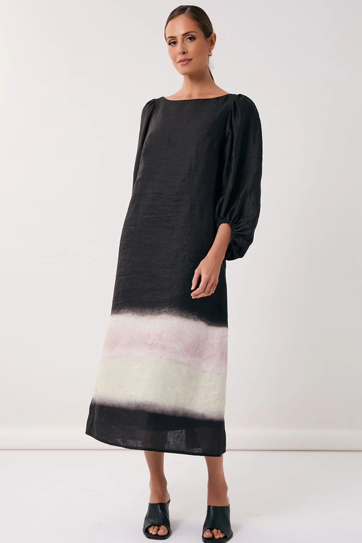Elevate your wardrobe with the MARION DRESS, crafted from 100% linen in an exclusive Adorne print. Featuring a classic boat neckline and elegant bell sleeves, this effortlessly chic piece is finished with a button and loop back closure, soft internal lining, and a subtle back hem split for ease of movement.