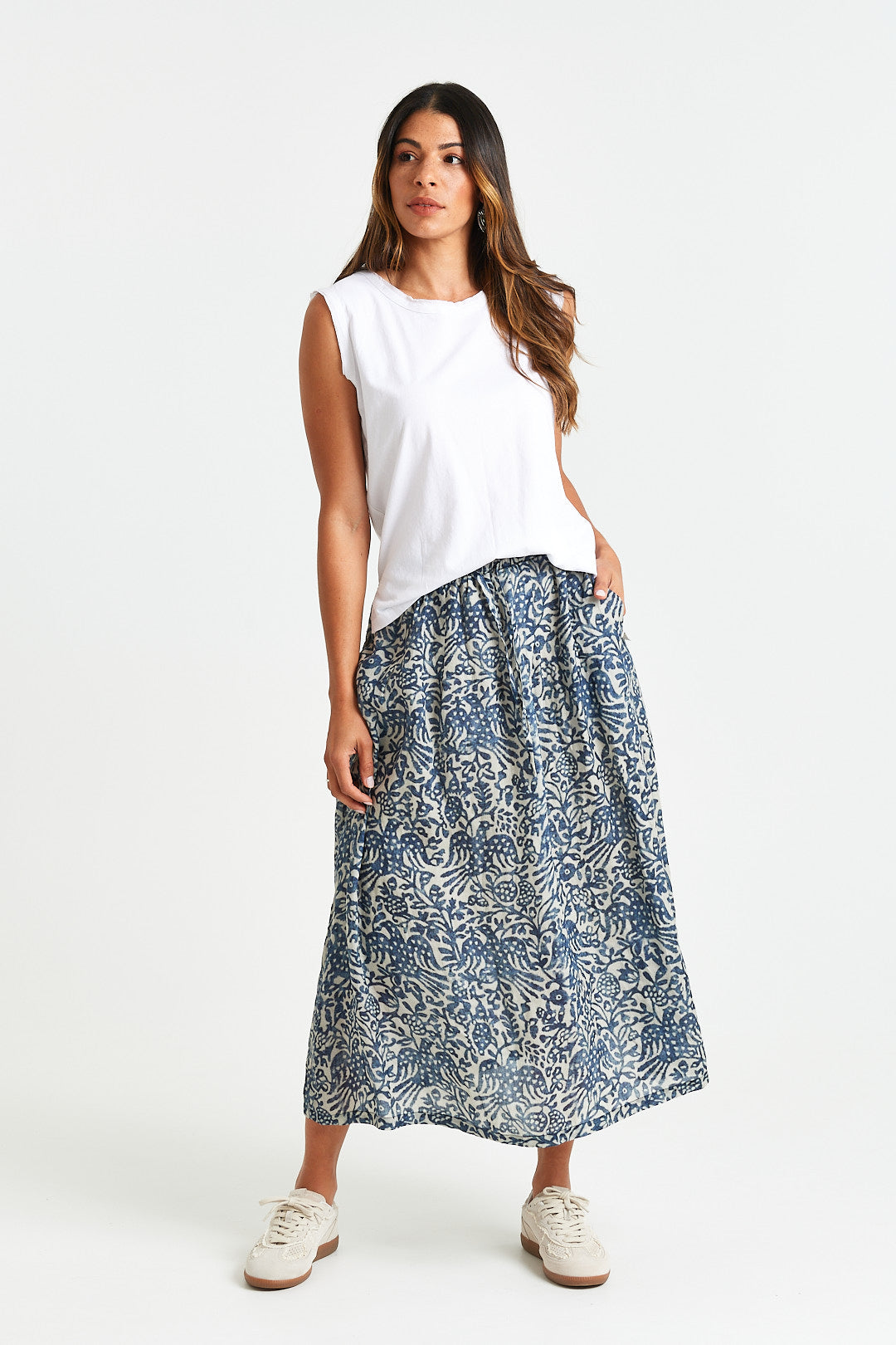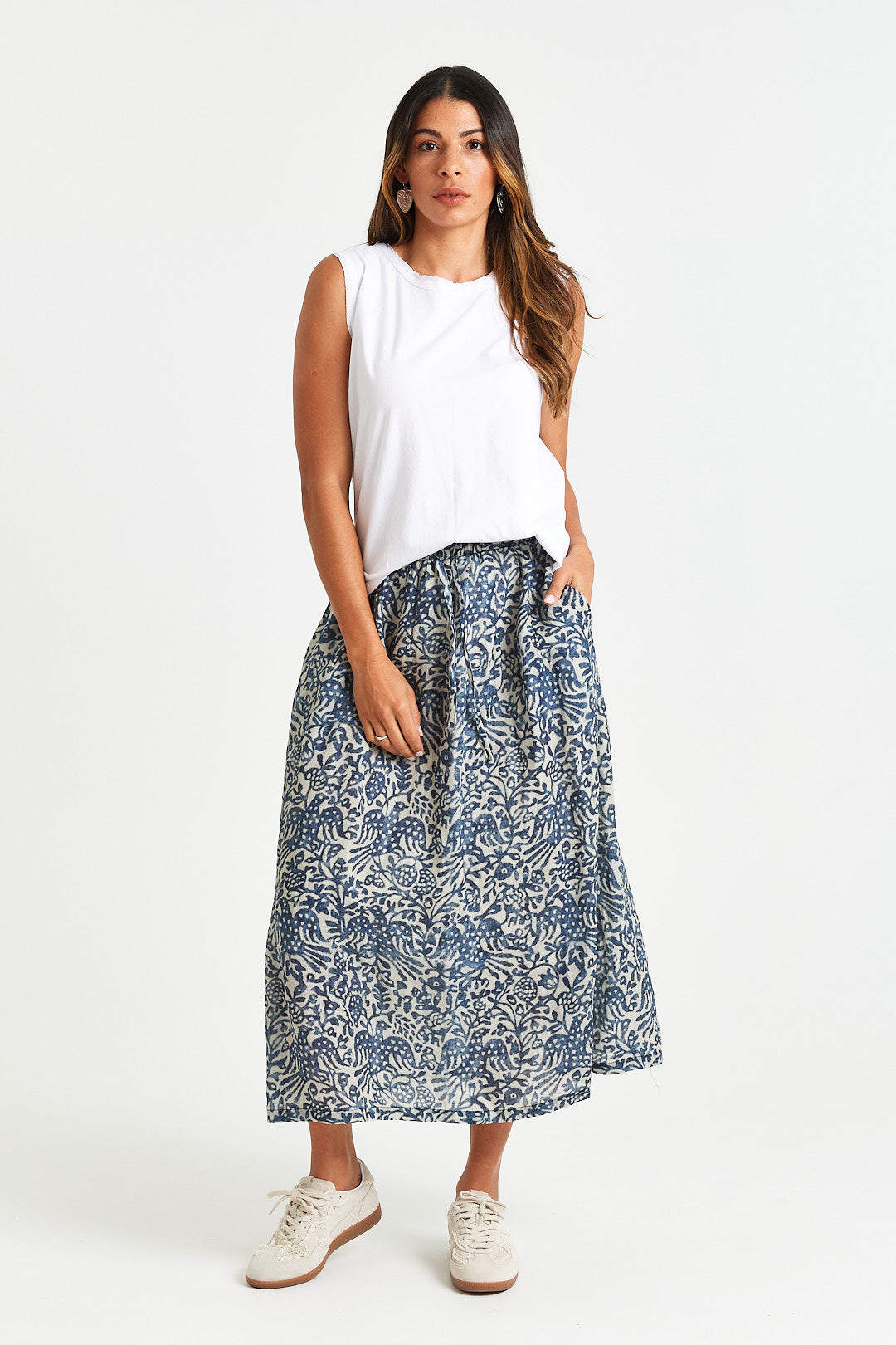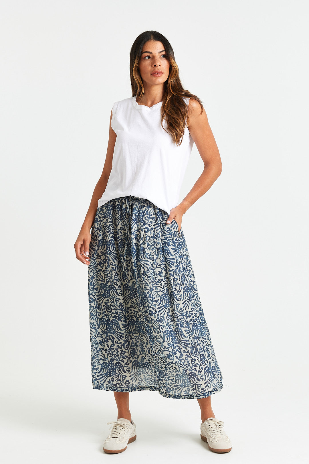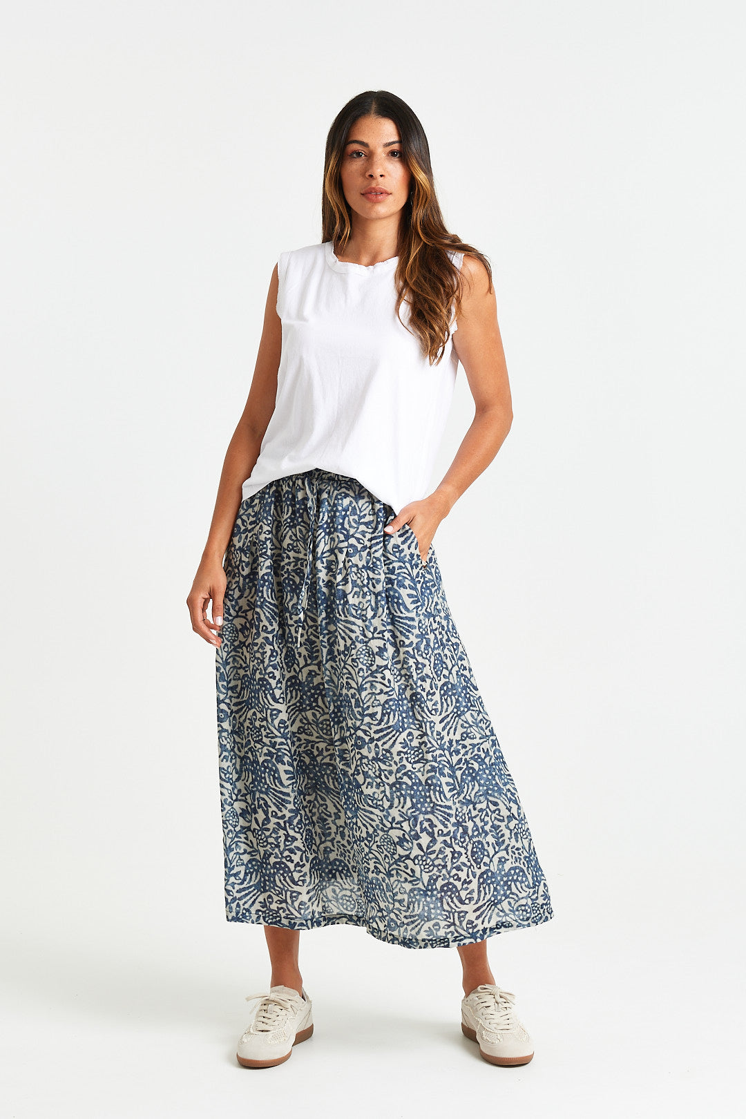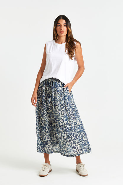 A breezy midi skirt in a soft blue print, featuring an elastic waistband with a functional tie, side pockets, and lining for all-day comfort and ease.