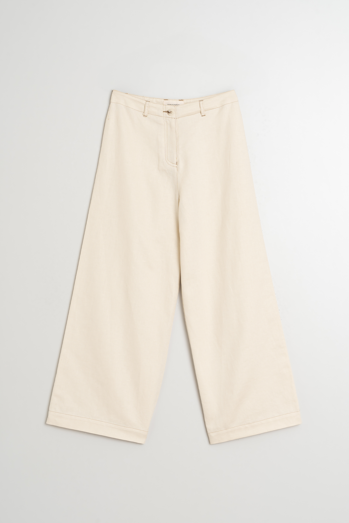 This pant has a high waist with zipper and button closure and twill fabric with contrast stitching. Pair these with the matching jacket!