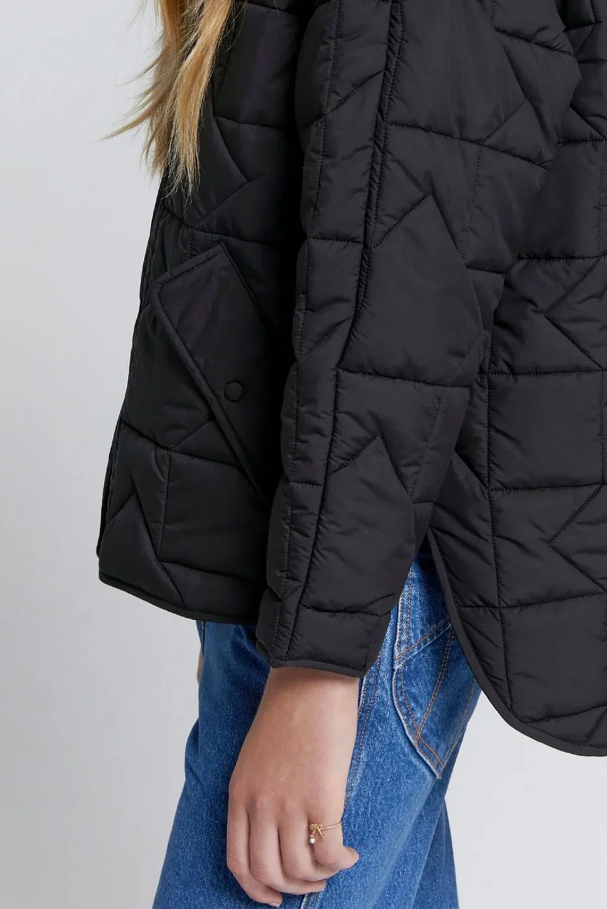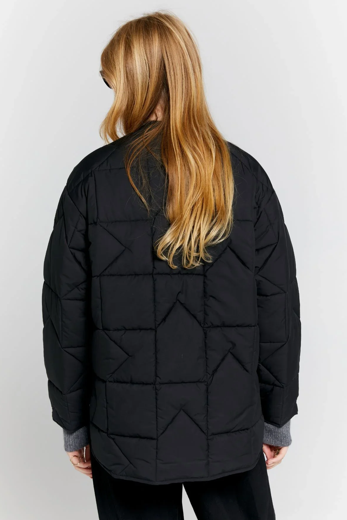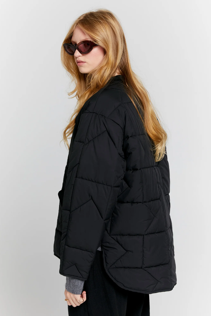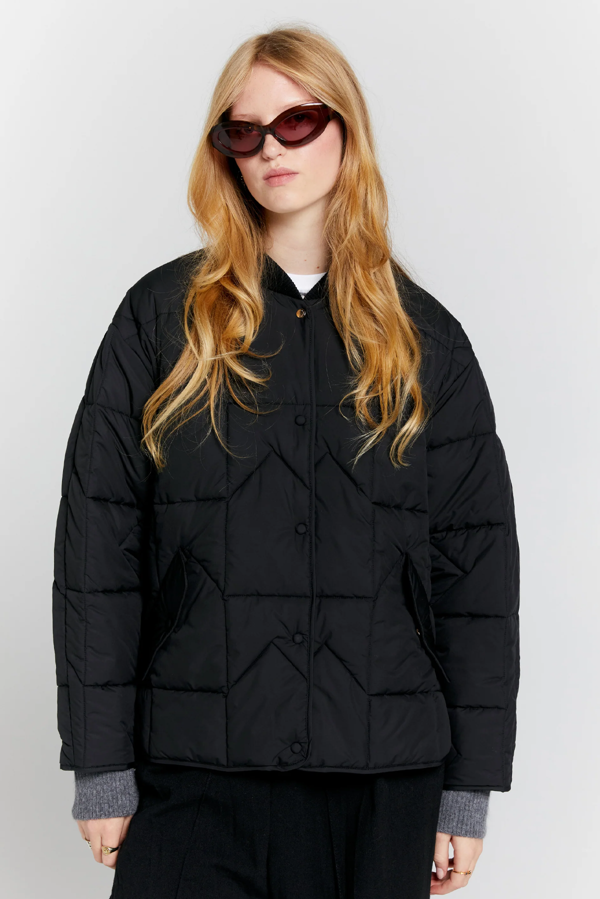 Quilted with the signature KW monogram pattern, the Monogram Jacket strikes the perfect balance of comfort and chic utilitarian style, making it a wardrobe staple. The lightweight shell, featuring vegan padded fill, offers warmth without bulk—ideal for year-round wear. Its relaxed fit, ribbed collar, and snap closures combine with a contemporary curved hem and bound edges for a refined aesthetic. Patch envelope pockets on the front add a functional touch, while the signature Runaway Girl stamp on the back completes the elevated design.