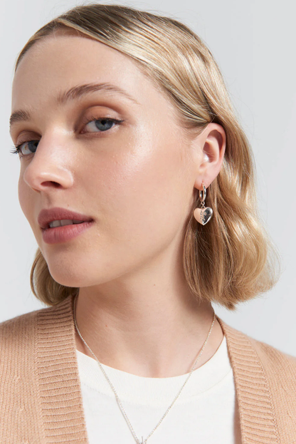 The iconic Runaway Girl is now wrapped in love, transforming into the Runaway Heart. The exaggerated, puffy heart highlights the Runaway Girl with a chic, modern twist on the traditional Victorian heart. Discover the Runaway Heart in sterling silver, swinging from elegant huggie hoops.