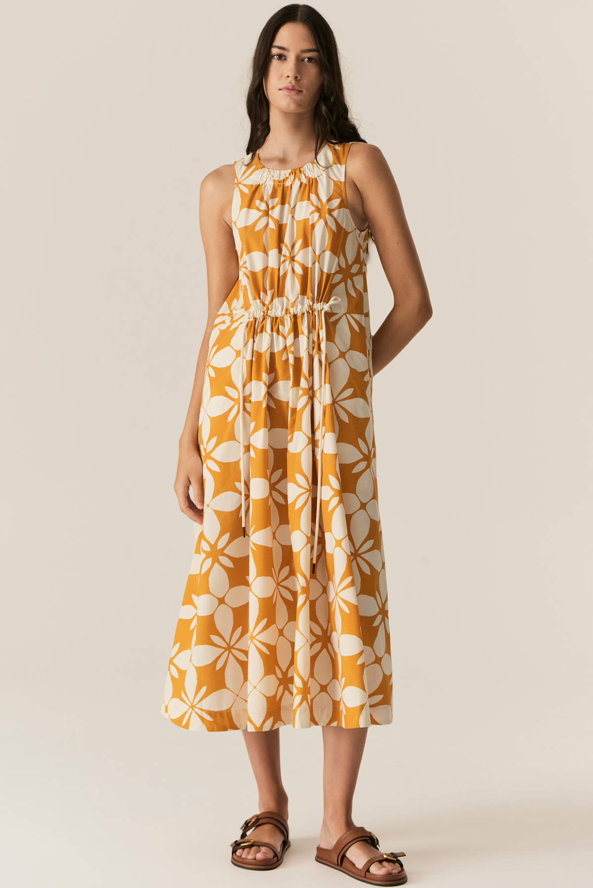 The Turin Tank Dress is an easy, elevated style crafted in 100% cotton with our exclusive Turin Print. Featuring a round neckline with soft gathers, a sleeveless silhouette, and a relaxed fit through the bodice, it cinches at the waist with a natural drawcord for shape. Finished with hip pockets and a full midi skirt, it’s both functional and refined.