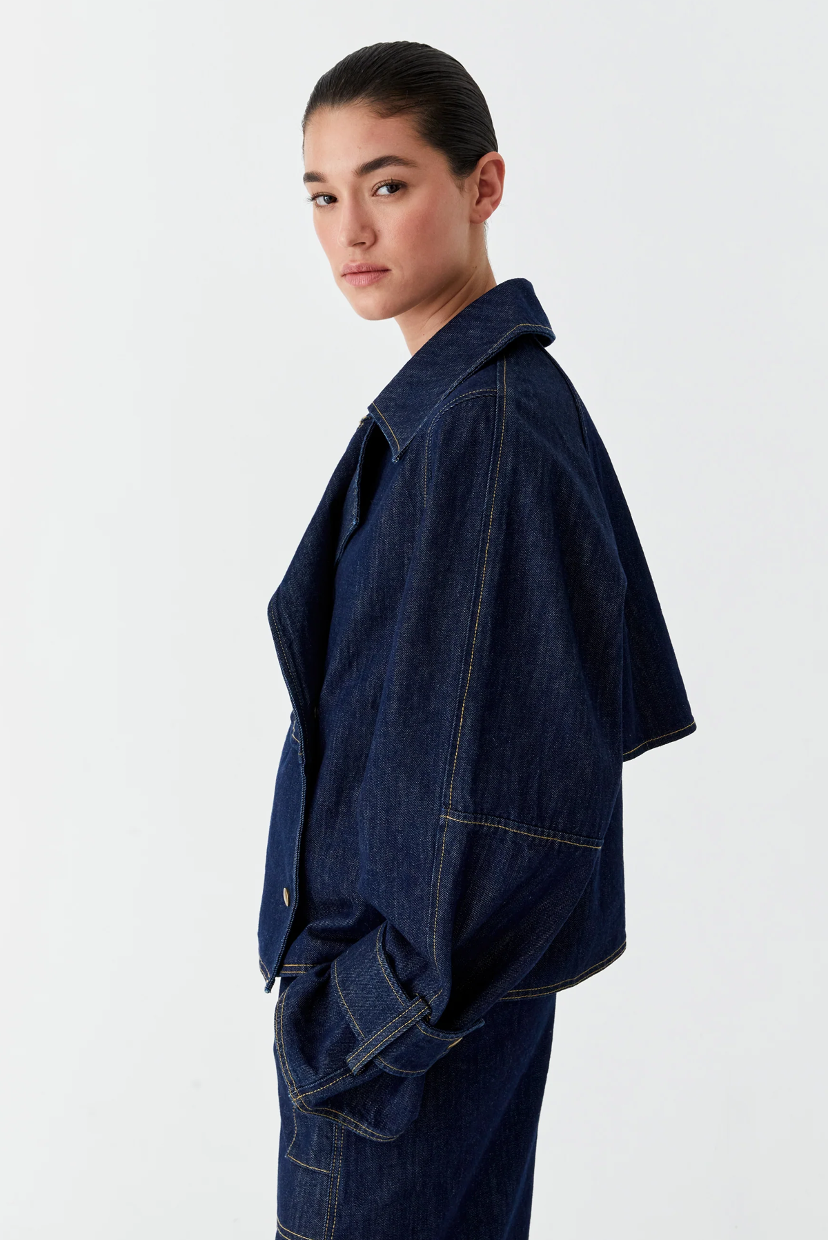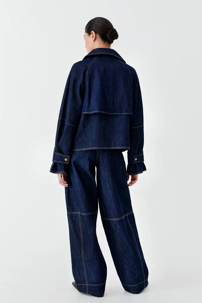 Made from mid-weight cotton denim, the Tyler Denim Jacket brings a modern take on a classic trench-style silhouette. It features a wide collar, full-length sleeves with tab and adjustable button cuffs, and internal press stud fastenings. Detailed with a button front and front welt pockets.