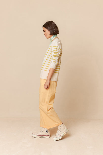 We have the basic sweater that saves all our looks, it features a slightly dropped shoulder, low neck and ribbed cuffs. The sailor stripes makes it a versatile garment.