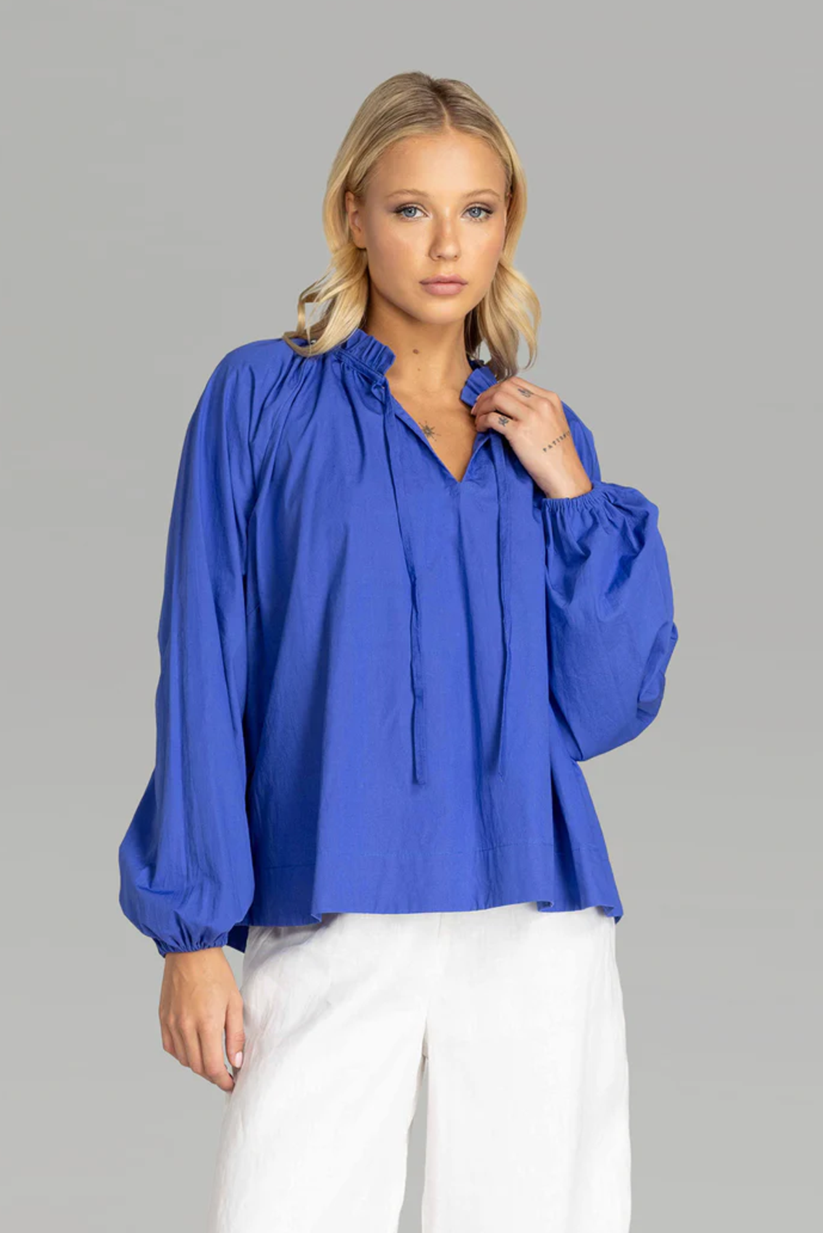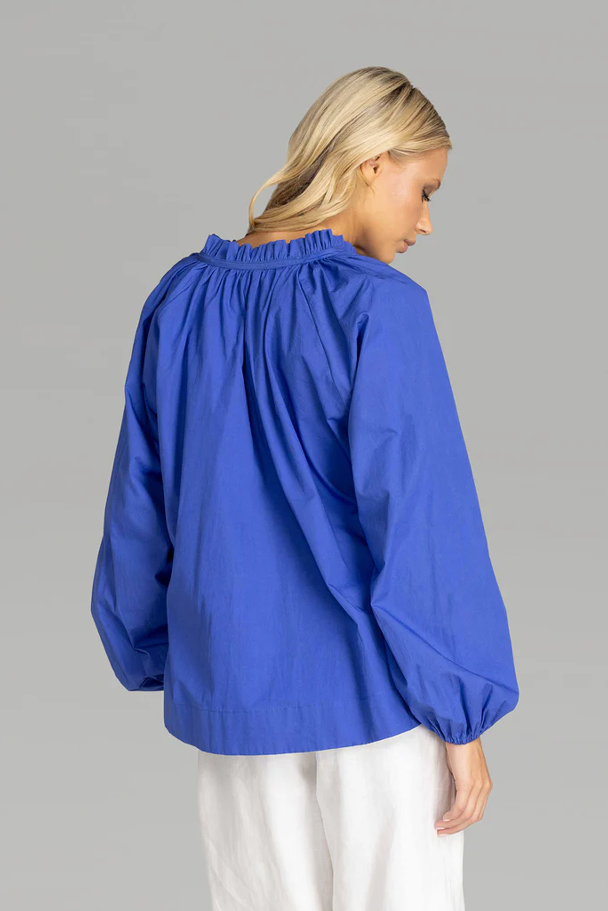 The Veronica Top in Juniper Blue presents an exquisite interpretation of refined casual elegance, meticulously crafted from premium cotton voile. Distinguished by its round neckline adorned with a delicate stand frill, the design features sophisticated gathering at the neckline that creates a flattering silhouette. A tasteful front keyhole with ties offers both aesthetic appeal and practical adjustability. The long, billowed raglan sleeves culminate in a refined elasticated hem, providing graceful movement with structured finish.