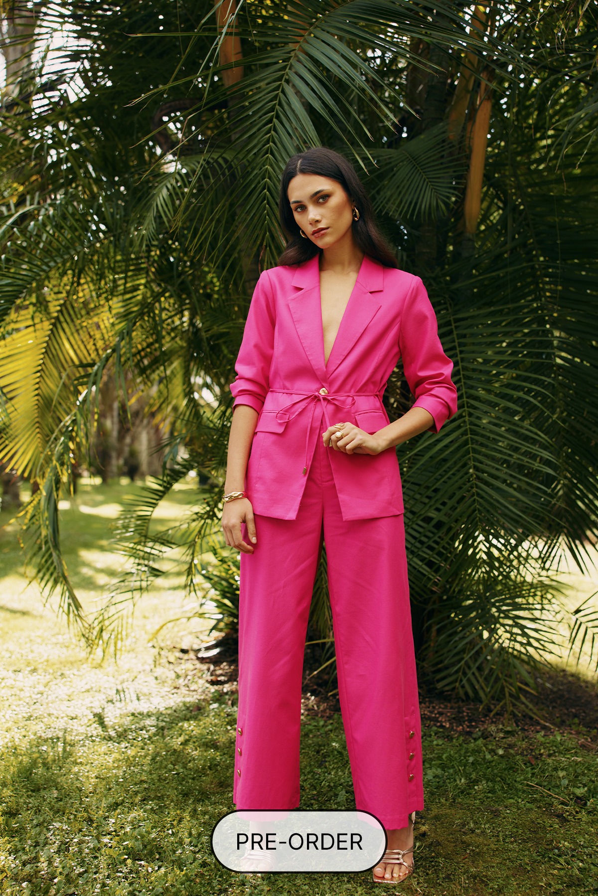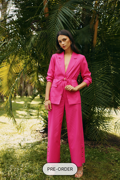 Elevated, longline blazer with flattering seam details, and front pockets. Featuring a detachable waist tie, looping onto exposed side back buttons, for personalization in fit and styling.