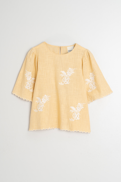 Blouse with contrasting floral embroidery on cotton. This is a special garment with a square fit and butterfly sleeves with scalloped finish.