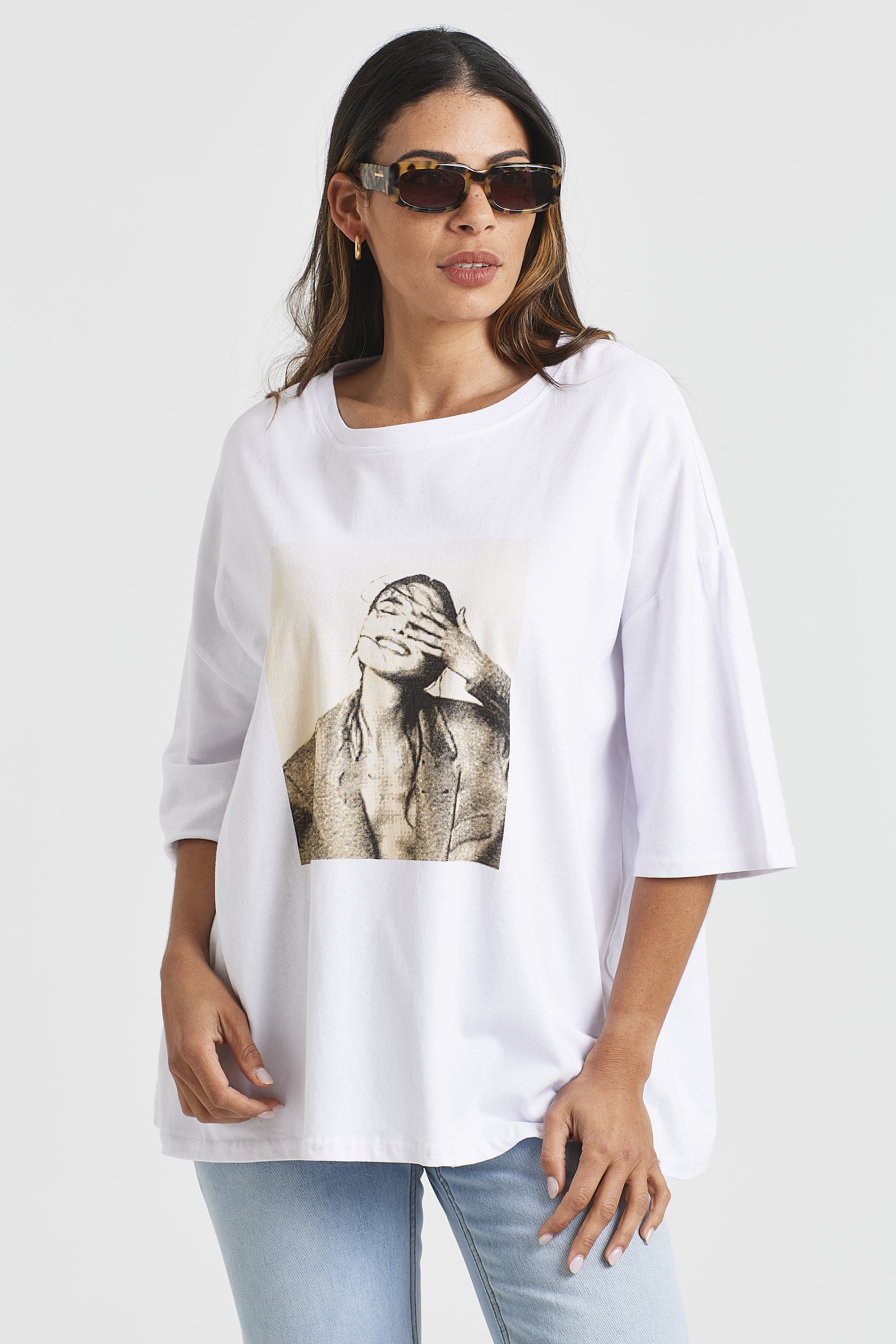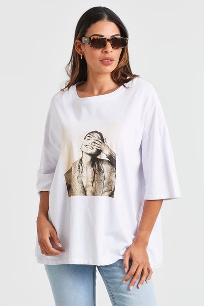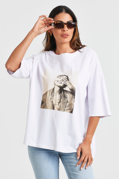 An everyday essential with a relaxed edge, the Zulma Tee is crafted from cotton in classic white. Featuring a chest print, oversized fit, and dropped shoulders, it’s the perfect go-to for effortless, off-duty style.